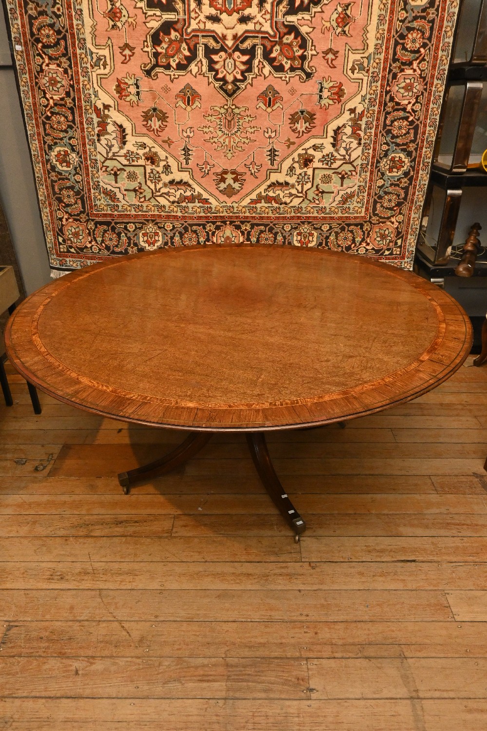 A GEORGE III MAHOGANY CIRCULAR DINING TABLE, THE TOP CROSS-BANDED IN ROSEWOOD AND YEW AND WITH BRASS AND BOXWOOD STRINGING (A/F) (72H X 160D CM) (PLEASE NOTE THIS HEAVY ITEM MUST BE REMOVED BY CARRIERS AT THE CUSTOMER'S EXPENSE. LEONARD JOEL STAFF CANNOT ASSIST CARRYING THIS ITEM) (X-LARGE ITEM)