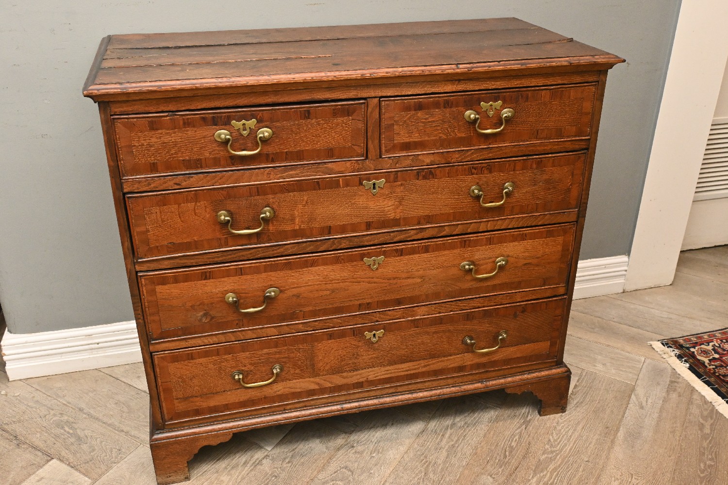 A GEORGE III OAK CHEST OF DRAWERS, THE DRAWER FRONTS CROSS-BANDED IN YEW (A/F) (98H X 110W X 53D CM) (PLEASE NOTE THIS HEAVY ITEM MUST BE REMOVED BY CARRIERS AT THE CUSTOMER'S EXPENSE. LEONARD JOEL STAFF CANNOT ASSIST CARRYING THIS ITEM) (X-LARGE ITEM)
