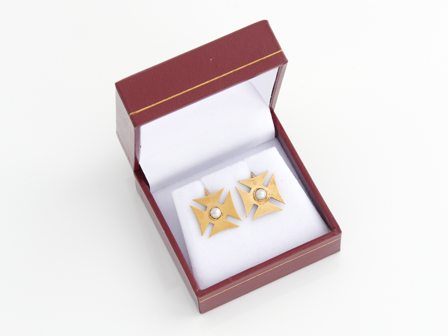 A PAIR OF ANTIQUE PEARL SET MALTESE CROSS EARRINGS IN 18CT GOLD , TO HOOK FITTINGS, 2.3GMS