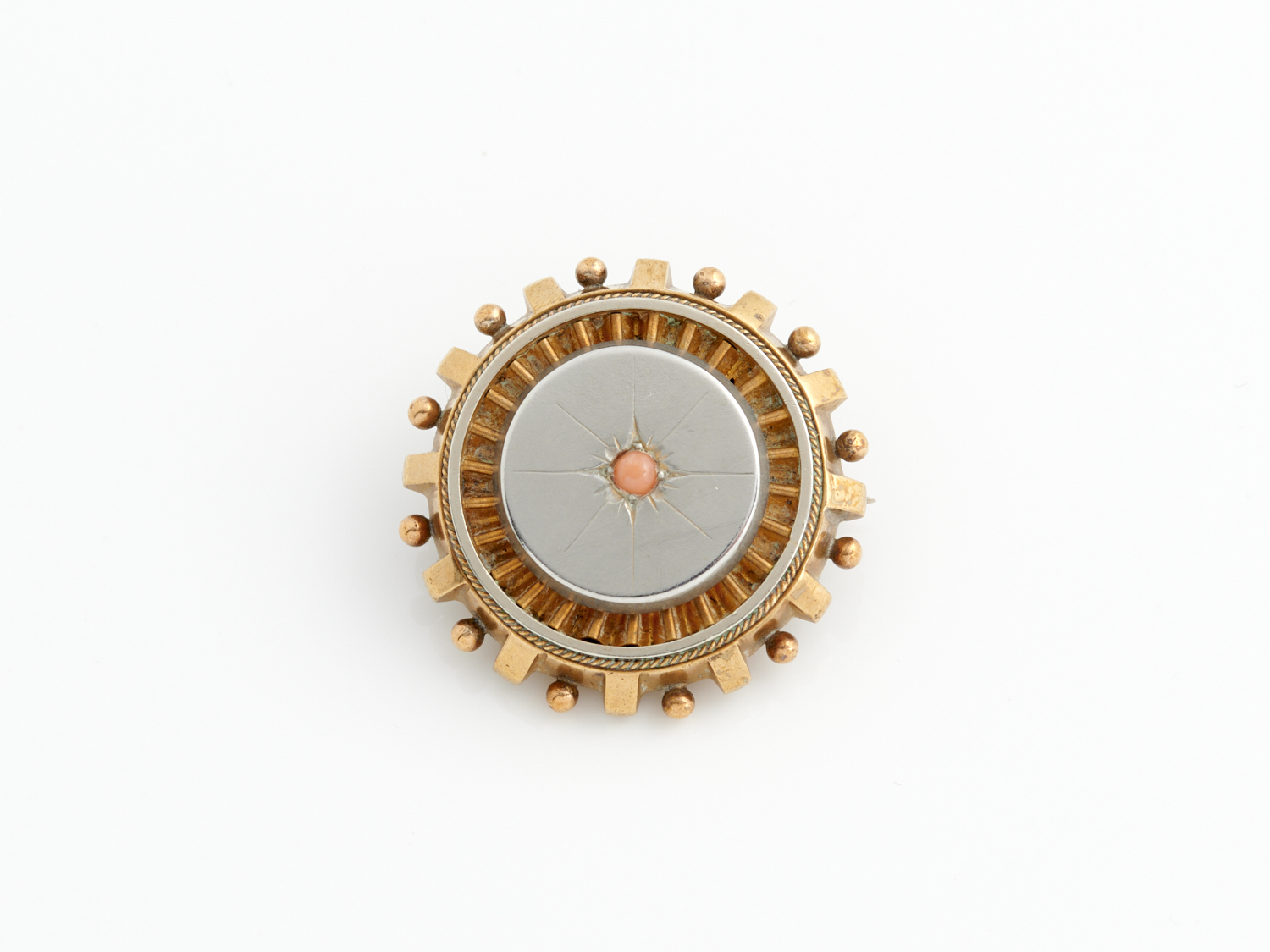A VICTORIAN CORAL TARGET BROOCH IN SILVER GILT, DIAMETER 35MM