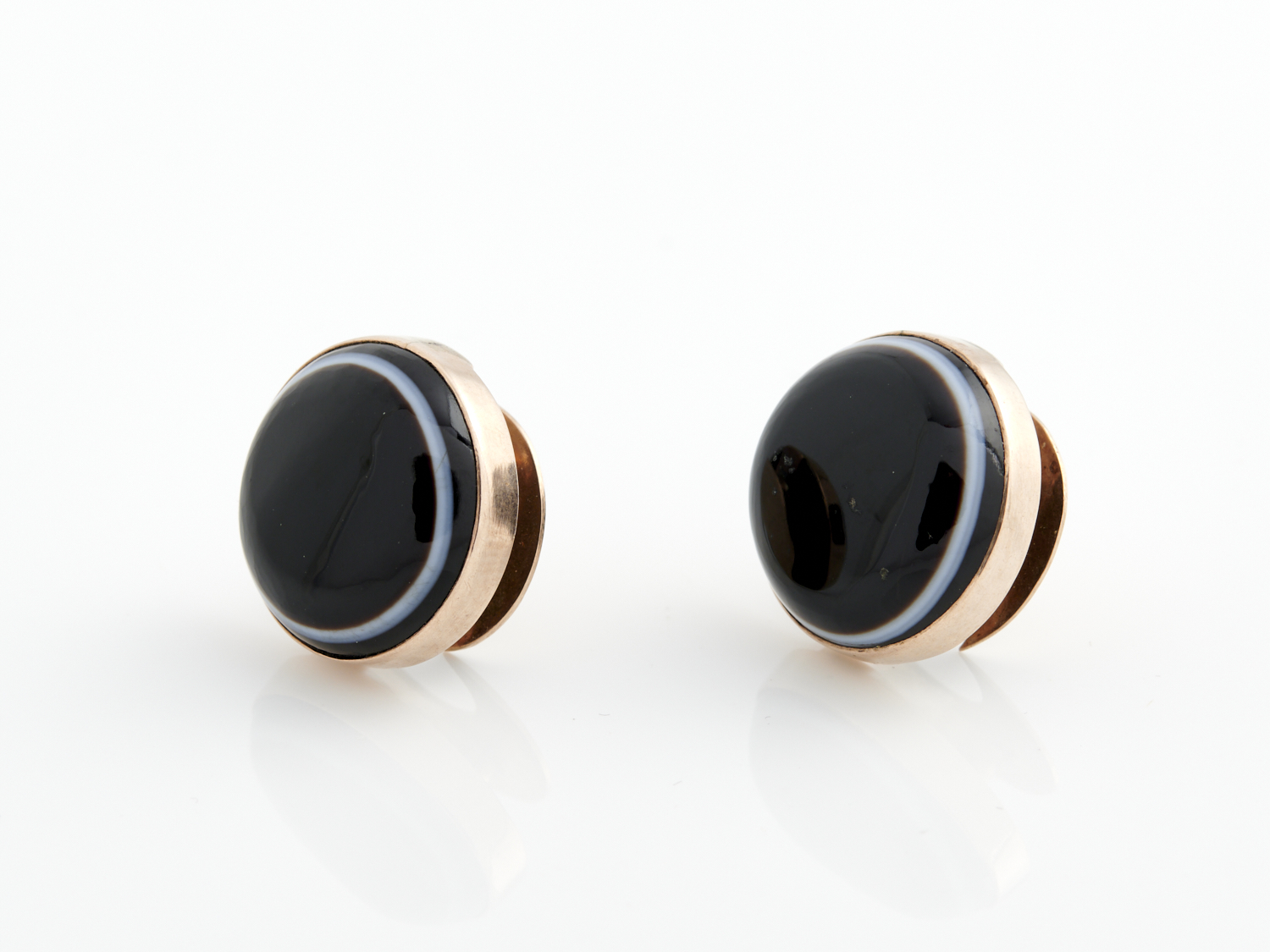 A PAIR OF BANDED AGATE LAPEL STUDS IN 9CT GOLD, 20MM DIAMETER, 4.8GMS