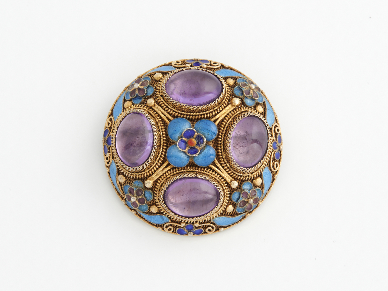 A VINTAGE AMETHYST AND ENAMEL BROOCH IN SILVER GILT, 40MM DIAMETER