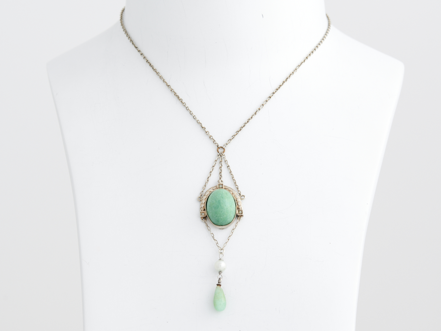 AN ART DECO JADE AND PEARL PENDANT IN SILVER, 360MM