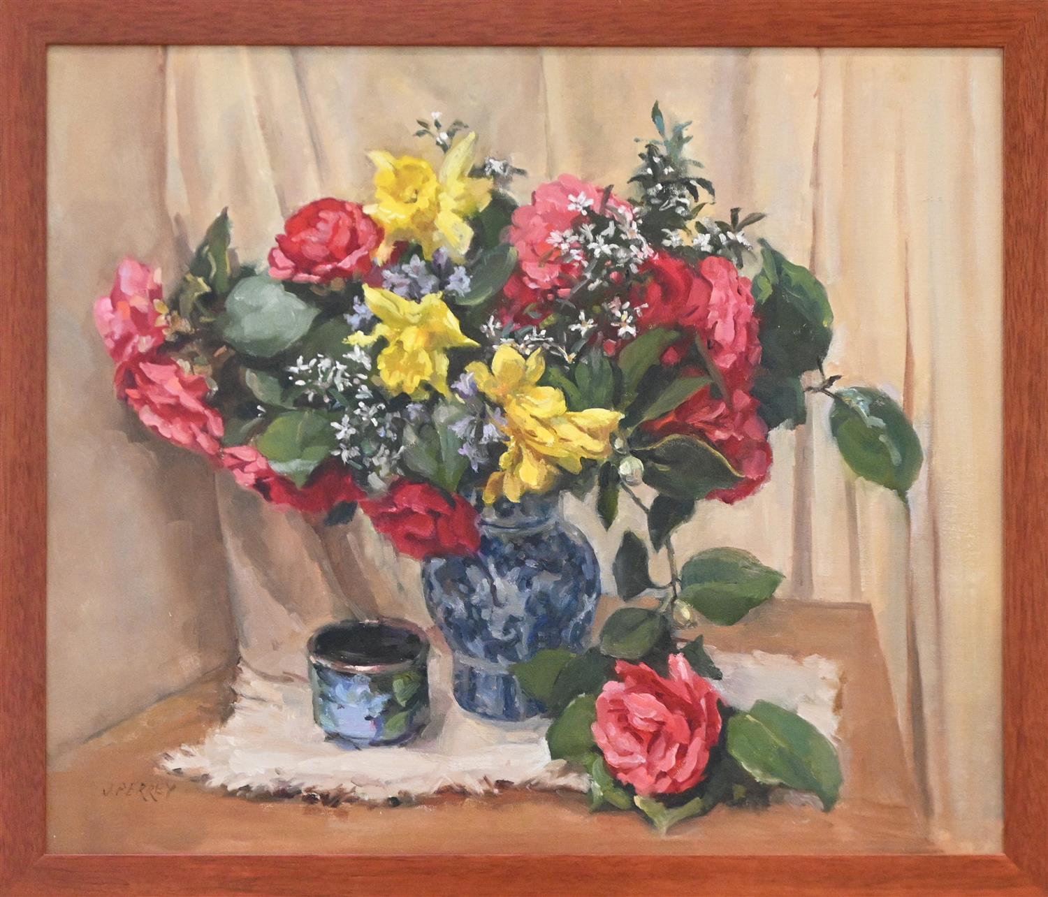 JUDITH PERREY, DAFFODILS AND CAMELLIAS, OIL ON CANVASBOARD, SIGNED LOWER LEFT, 50 X 60CM, FRAME SIZE: 56 X 66CM