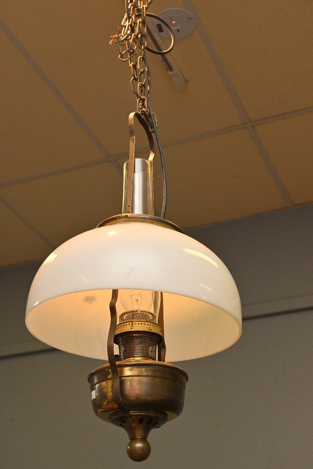 AN ANTIQUE 'ALADDIN' BRASS HANGING OIL LAMP, WITH MILK GLASS SHADE, CONVERTED TO ELECTRICITY (A/F) (35D CM) (LEONARD JOEL DELIVERY SIZE: X-LARGE)