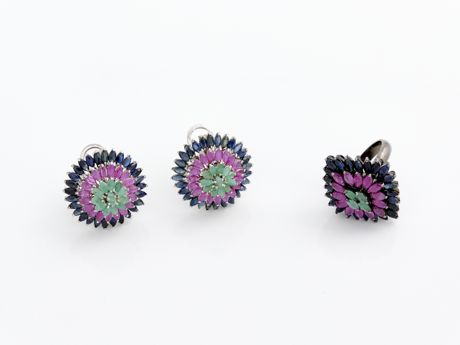 A GEM-SET JEWELLERY SUITE IN BLACKENED SILVER, COMPRISING A PAIR OF EARRINGS TO POST AND LEVER BACK FITTINGS AND A RING, RING SIZE P