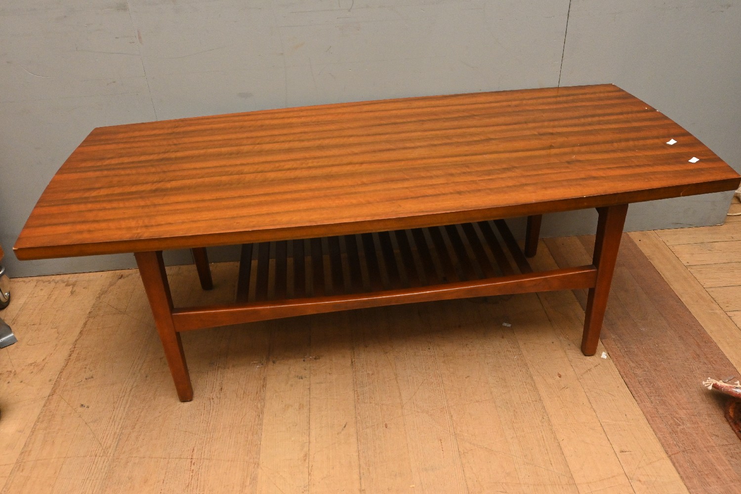 A RETRO AUSTRALIAN MADE SOLID WALNUT COFFEE TABLE WITH LOWER MAGAZINE RACK (A/F) (51H X 143W X 62D CM) (LEONARD JOEL DELIVERY SIZE: LARGE)
