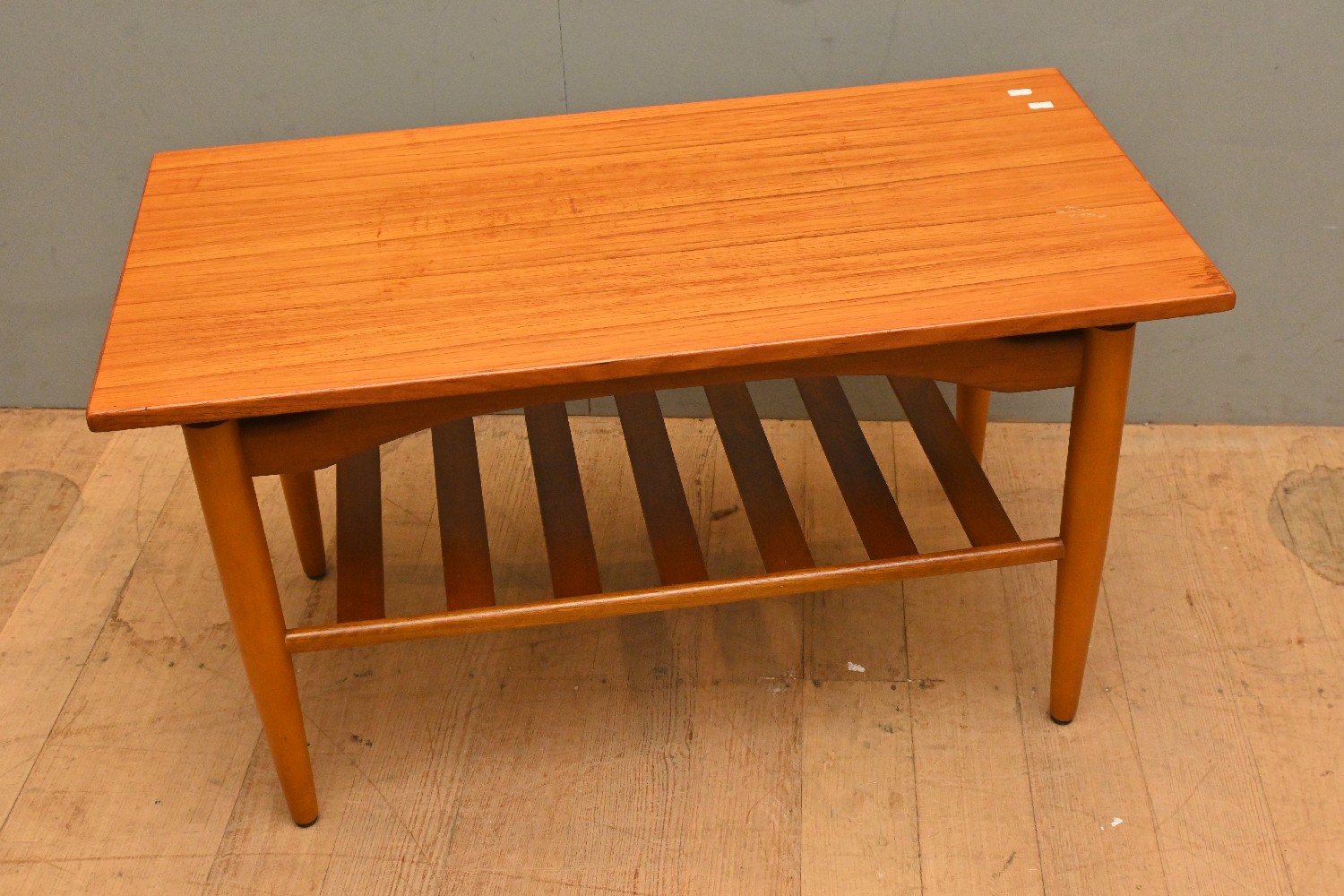 A RETRO AUSTRALIAN MADE TEAK RECTANGULAR COFFEE TABLE WITH LOWER MAGAZINE RACK (A/F) (51H X 90W X 45D CM) (LEONARD JOEL DELIVERY SIZE: LARGE)