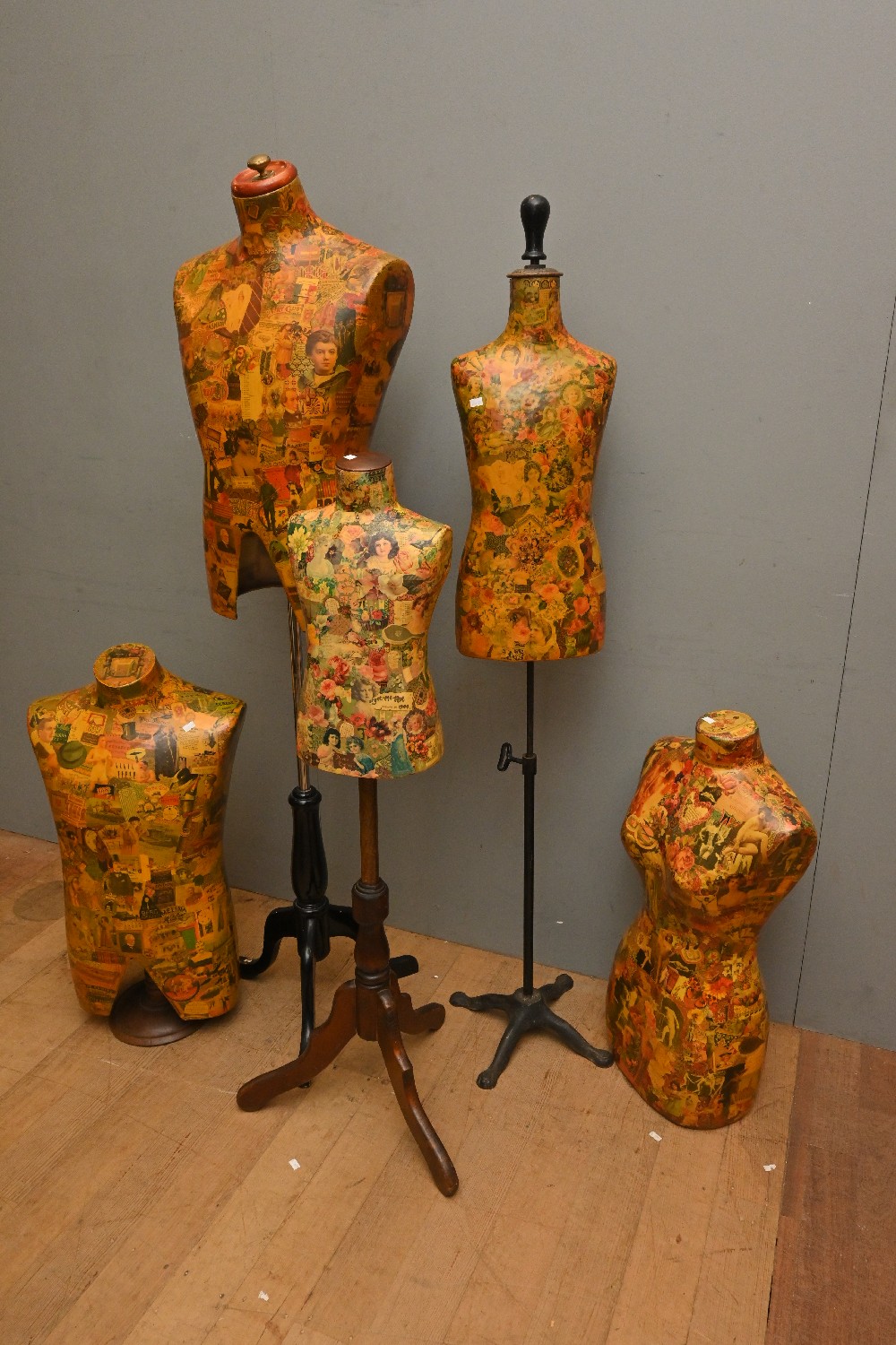 A COLLECTION OF FIVE VINTAGE WOODEN AND STEEL BASED DRESSMAKERS DISPLAY DUMMIES WITH DECOUPAGE FINISH (A/F) (162H CM) (LEONARD JOEL DELIVERY SIZE: X-LARGE)