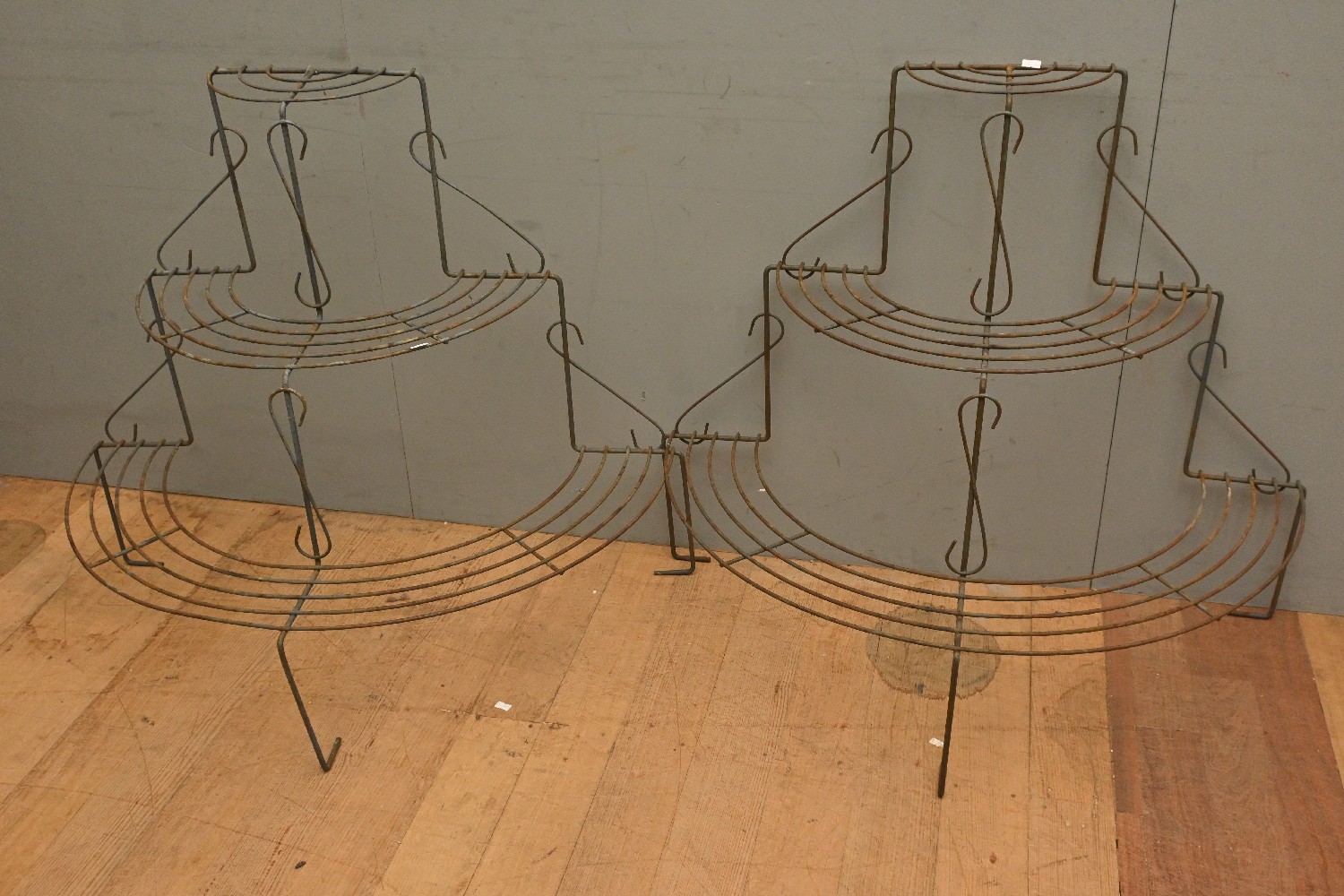 A PAIR OF VINTAGE SEMI CIRCULAR THREE TIER PLANT STANDS (80H X 89W X 49D CM) (LEONARD JOEL DELIVERY SIZE: LARGE)