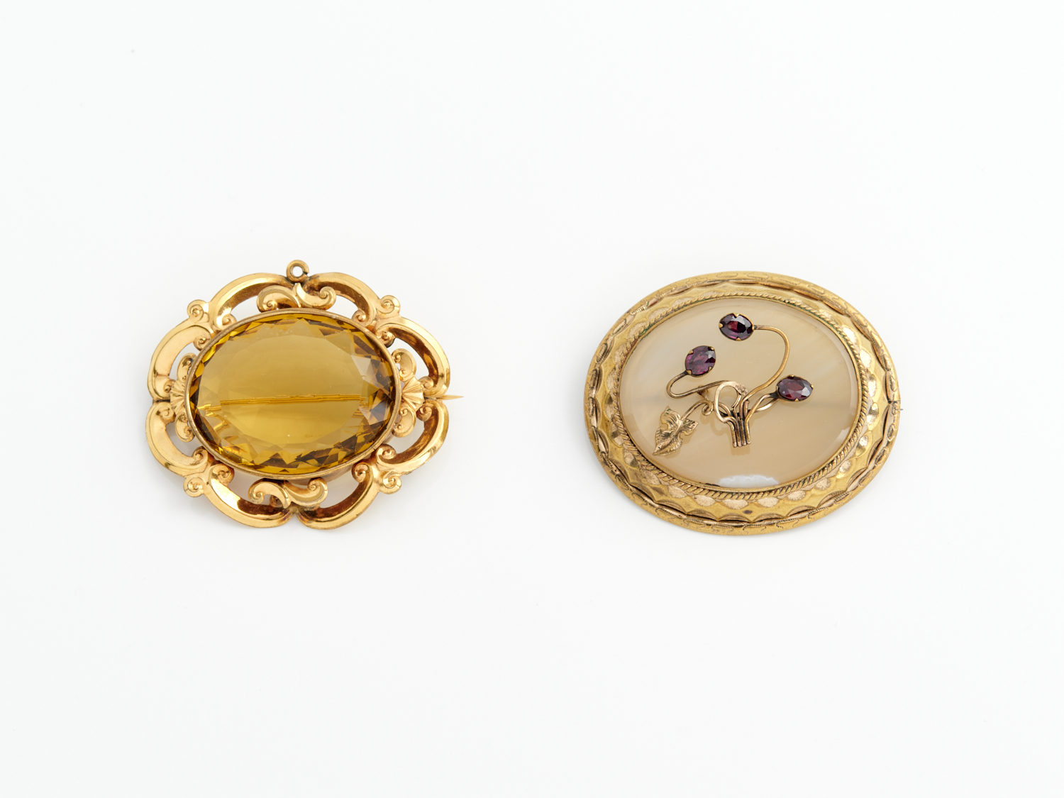 AN ANTIQUE CHALCEDONY AND ALMANDINE GARNET BROOCH TOGETHER WITH A PASTE SET BROOCH
