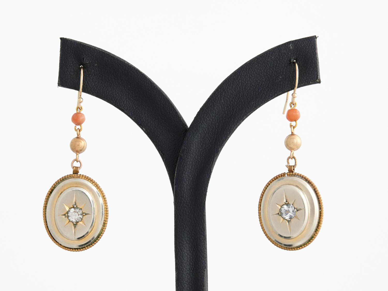 A PAIR OF VICTORIAN PASTE AND CORAL SET EARRING IN PINCHBECK, TO SHEPHERD HOOK FITTINGS, 50MM