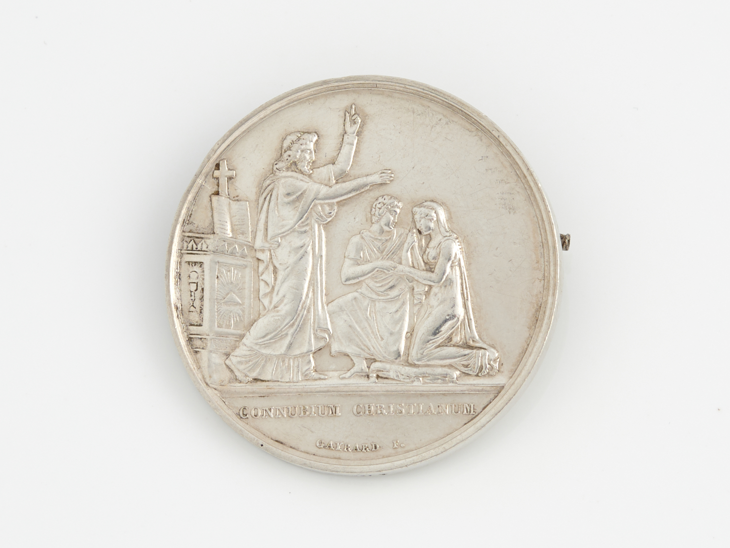 AN ANTIQUE FRENCH MARRIAGE MEDALLION BROOCH IN SILVER, 35MM DIAMETER