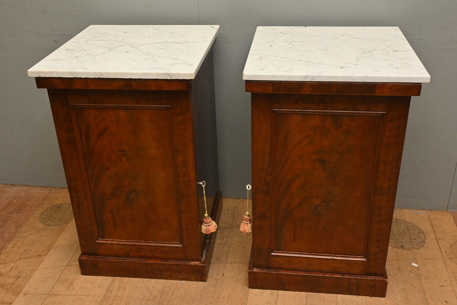 A PAIR OF MAHOGANY BEDSIDE TABLES WITH MARBLE TOPS - KEYS IN OFFICE (A/F) (85H X 53W X 56D CM) (PLEASE NOTE THIS HEAVY ITEM MUST BE REMOVED BY CARRIERS AT THE CUSTOMER'S EXPENSE. LEONARD JOEL STAFF CANNOT ASSIST CARRYING THIS ITEM) (X-LARGE ITEM)