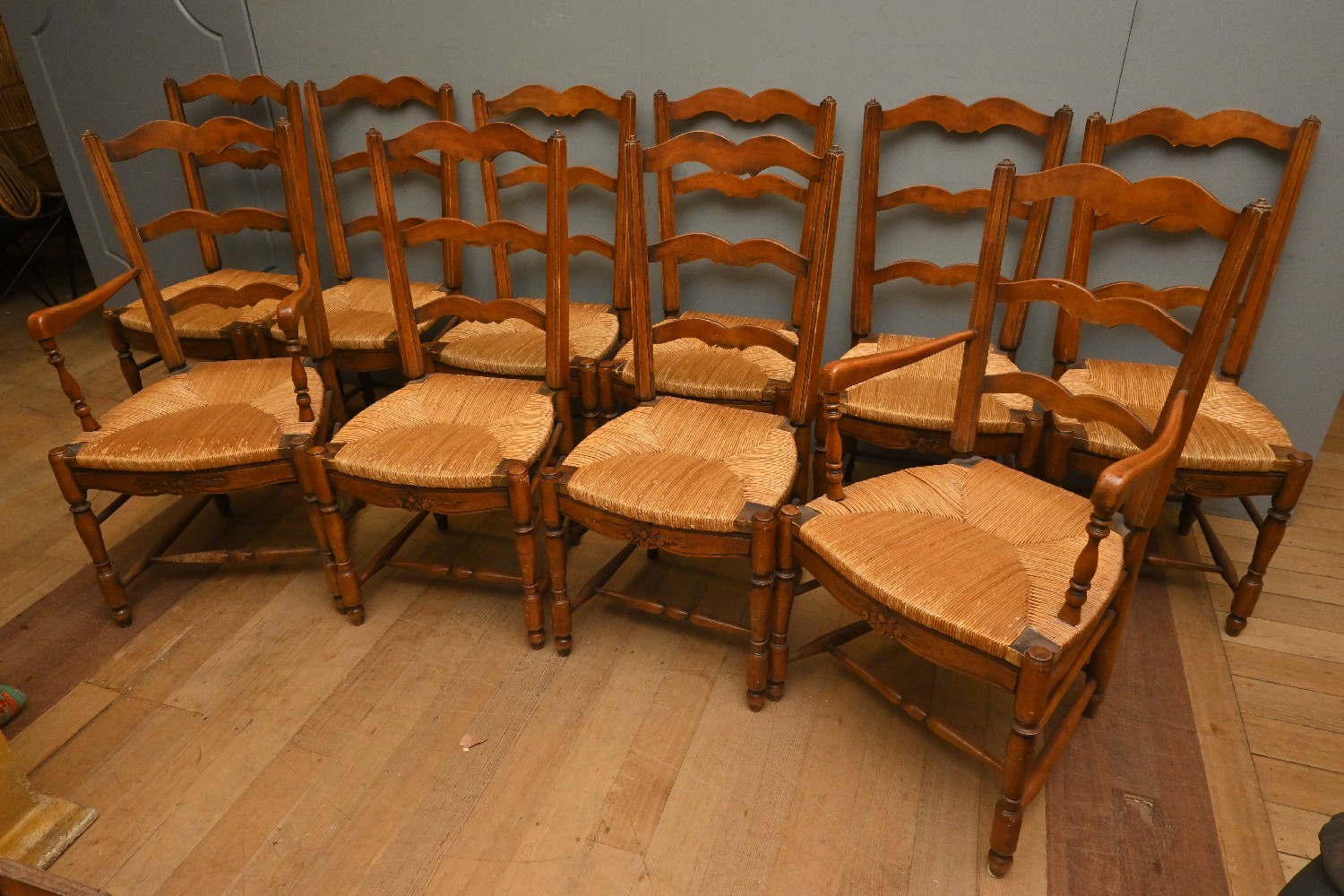 A SET OF TEN FRENCH STYLE LADDERBACK DINING CHAIRS WITH NATURAL RUSH SEATS (A/F) (100H X 53W X 48D CM) (PLEASE NOTE THIS HEAVY ITEM MUST BE REMOVED BY CARRIERS AT THE CUSTOMER'S EXPENSE. LEONARD JOEL STAFF CANNOT ASSIST CARRYING THIS ITEM) (X-LARGE ITEM)