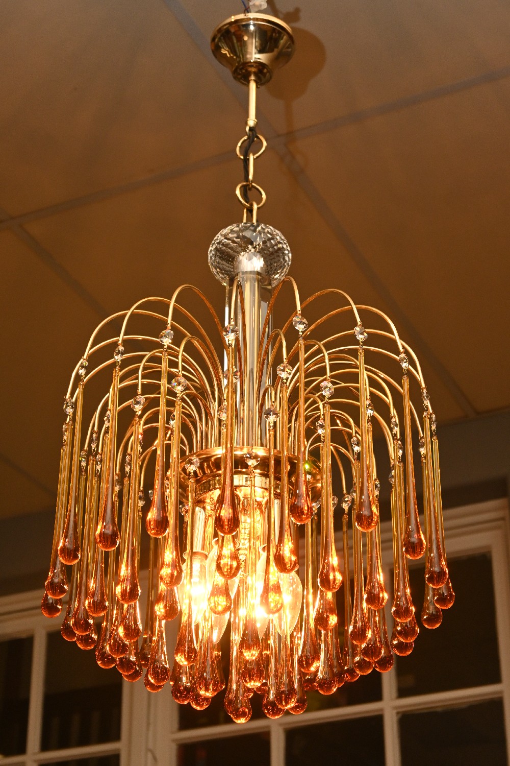 A SIX GLOBE MID 20TH CENTURY AMBER MURANO GLASS CHANDELIER (90H X 50DIA CM) (PLEASE NOTE THIS HEAVY ITEM MUST BE REMOVED BY CARRIERS AT THE CUSTOMER'S EXPENSE. LEONARD JOEL STAFF CANNOT ASSIST CARRYING THIS ITEM) (X-LARGE ITEM)