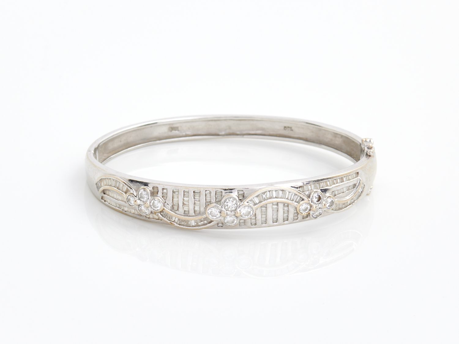 A DIAMOND SET HINGED BANGLE IN 18CT WHITE GOLD, INNER MEASUREMENT 60 X 50MM