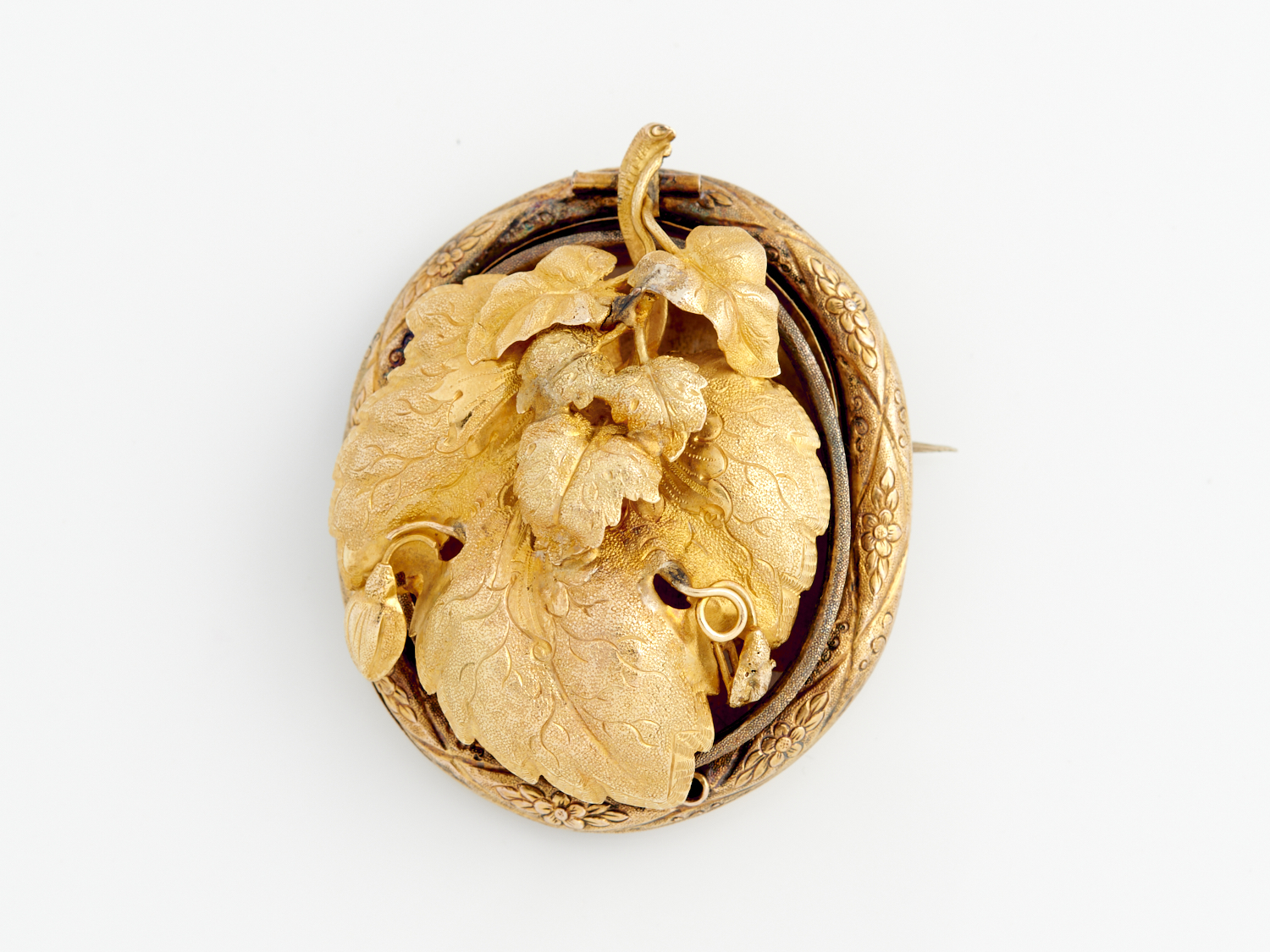 AN ANTIQUE GOLDFIELDS LOCKET WITH EXTERNAL CASE IN 20CT GOLD, 50 X 42MM, 22.8GMS INCLUDING GLASS, A/F