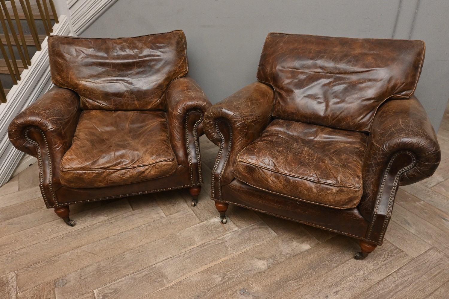 A PAIR OF VICTORIAN-STYLE UPHOLSTERED ARMCHAIRS IN CHOCOLATE BROWN LEATHER (A/F) (89H X 110W X 115D CM) (PLEASE NOTE THIS HEAVY ITEM MUST BE REMOVED BY CARRIERS AT THE CUSTOMER'S EXPENSE. LEONARD JOEL STAFF CANNOT ASSIST CARRYING THIS ITEM) (X-LARGE ITEM)