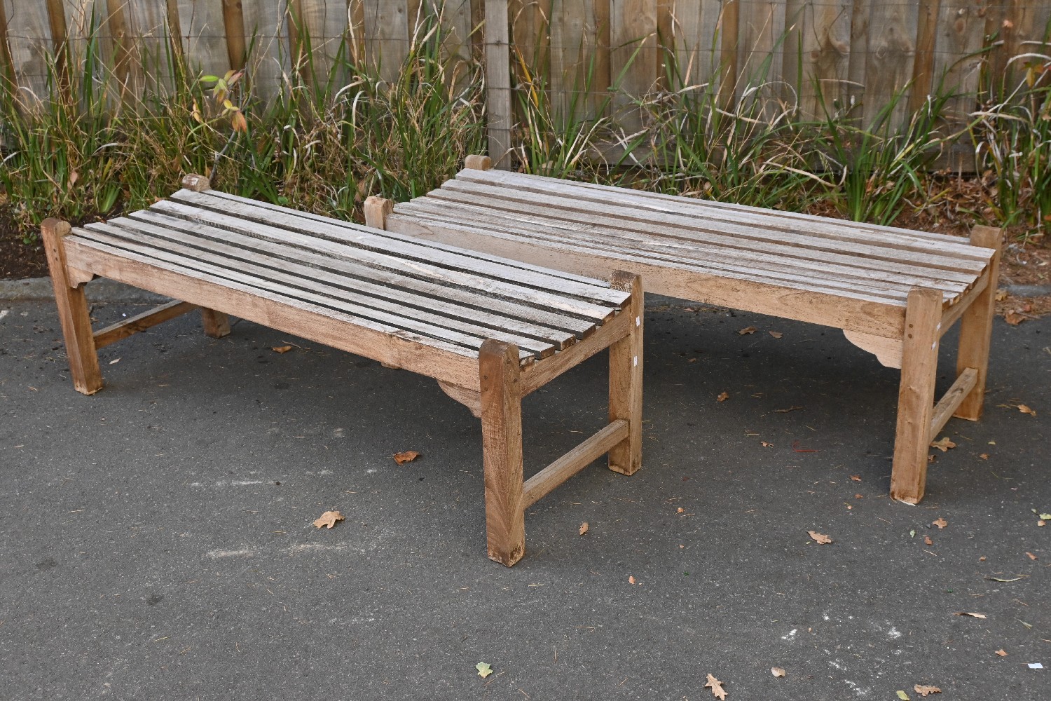 A PAIR OF TEAK BENCHES (A/F) (49H X 151W X 50D CM) (PLEASE NOTE THIS HEAVY ITEM MUST BE REMOVED BY CARRIERS AT THE CUSTOMER'S EXPENSE. LEONARD JOEL STAFF CANNOT ASSIST CARRYING THIS ITEM) (X-LARGE ITEM)