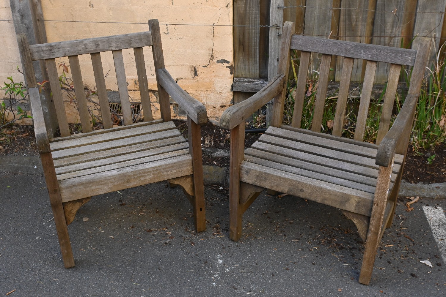A PAIR OF ELMWOOD DESIGNS TEAK CARVERS (A/F) (91H X 64W X 64D CM) (PLEASE NOTE THIS HEAVY ITEM MUST BE REMOVED BY CARRIERS AT THE CUSTOMER'S EXPENSE. LEONARD JOEL STAFF CANNOT ASSIST CARRYING THIS ITEM) (X-LARGE ITEM)