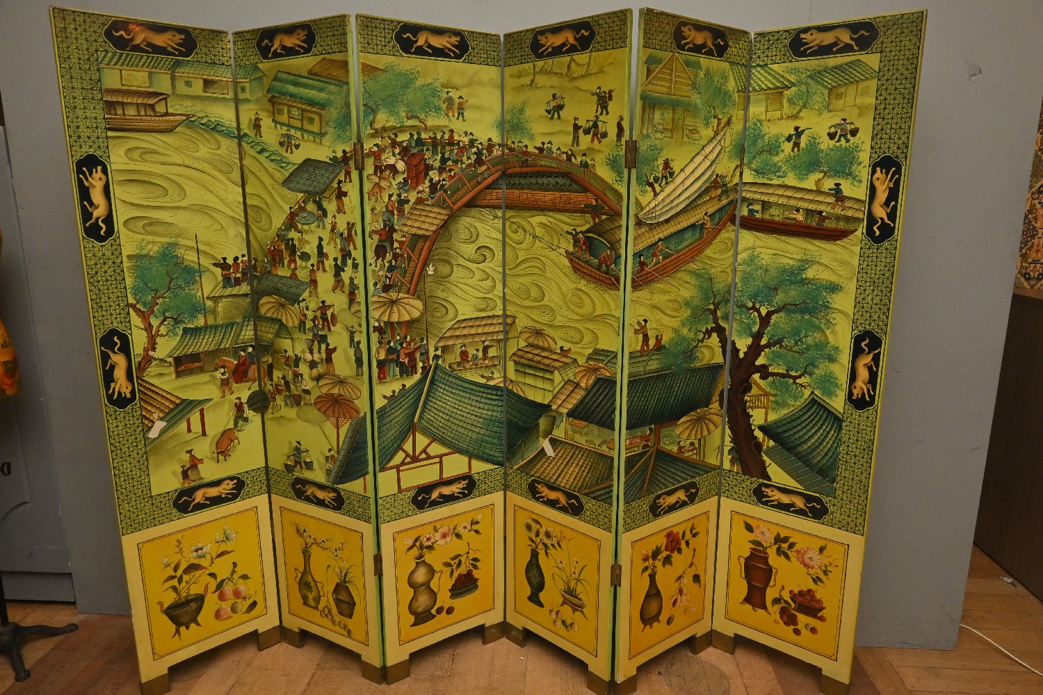 A SIX PANEL HAND PAINTED CHINESE PRIVACY SCREEN (A/F) (182H X 41W CM PER PANEL) (PLEASE NOTE THIS HEAVY ITEM MUST BE REMOVED BY CARRIERS AT THE CUSTOMER'S EXPENSE. LEONARD JOEL STAFF CANNOT ASSIST CARRYING THIS ITEM) (X-LARGE ITEM)