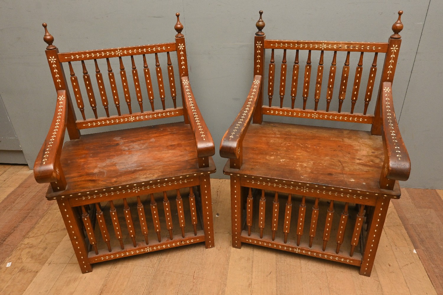 A PAIR OF BONE INLAID ARMCHAIRS (A/F) (101H X 63W X 58D CM) (LEONARD JOEL DELIVERY SIZE: X-LARGE)