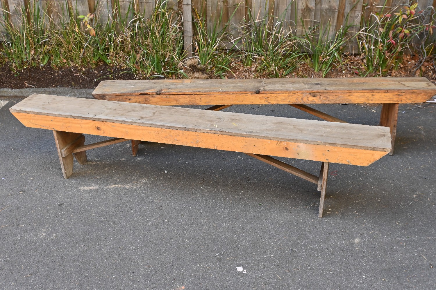 A PAIR OF RUSTIC BENCHES (A/F) (45H X 213W X 25D CM) (LEONARD JOEL DELIVERY SIZE: X-LARGE)