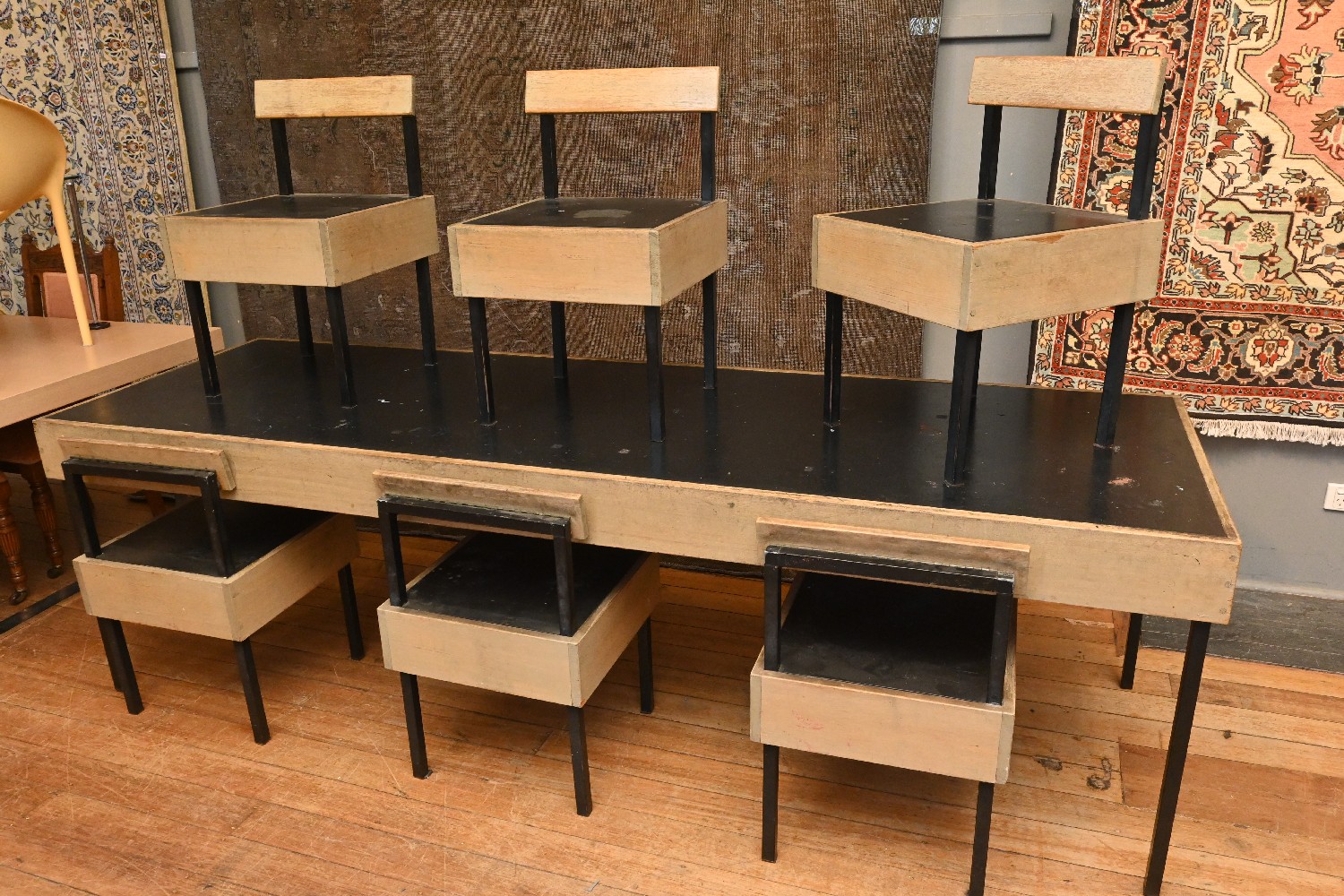 A CONTEMPORARY DESIGN SEVEN PIECE DINING SETTING (A/F) (75H X 249W X 79D CM) (PLEASE NOTE THIS HEAVY ITEM MUST BE REMOVED BY CARRIERS AT THE CUSTOMER'S EXPENSE. LEONARD JOEL STAFF CANNOT ASSIST CARRYING THIS ITEM) (X-LARGE ITEM)