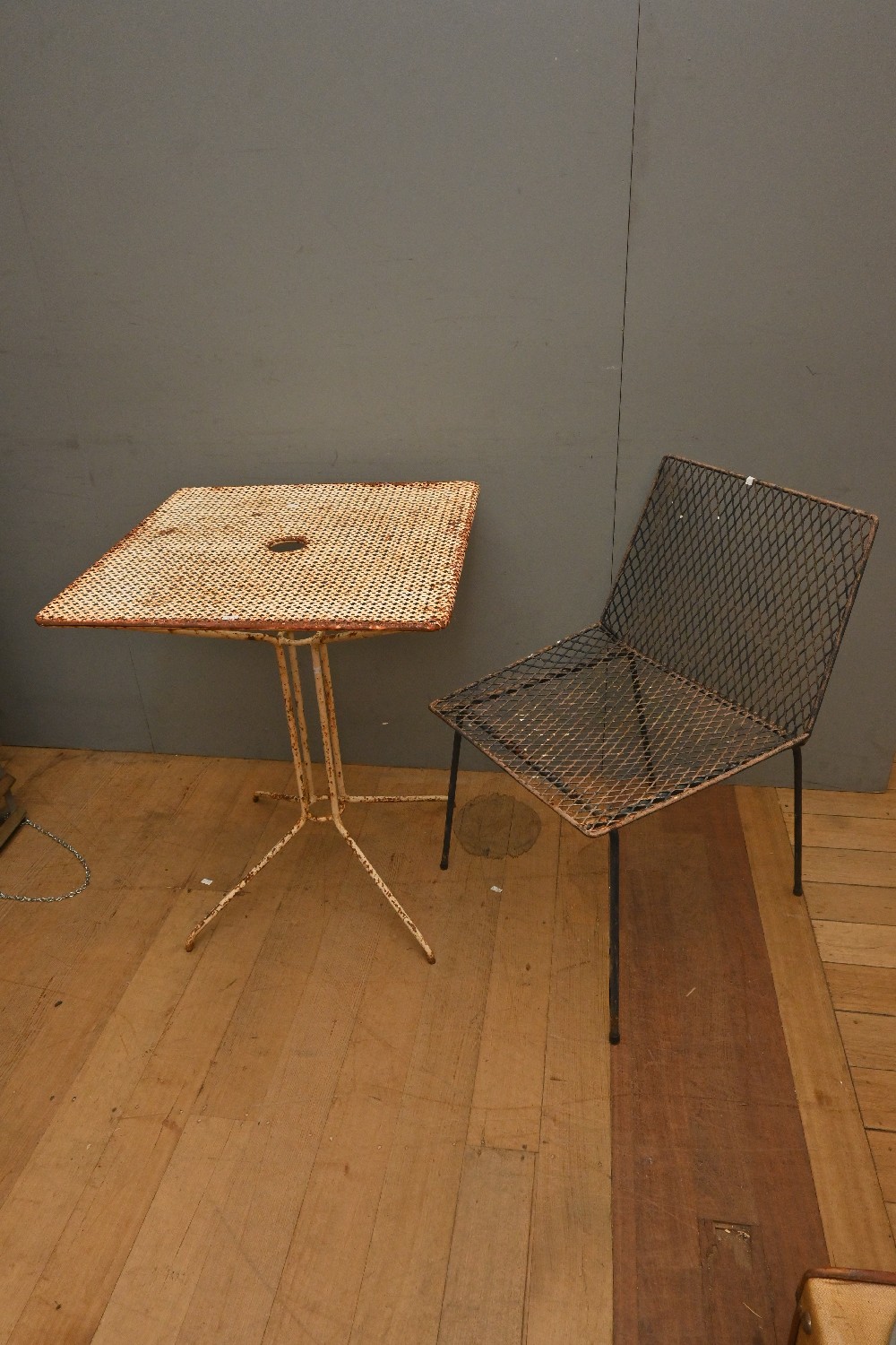 A WHITE METAL PERFORATED GARDEN TABLE WITH CHAIR (A/F) (73H X 60W X 60D CM) (LEONARD JOEL DELIVERY SIZE: X-LARGE)