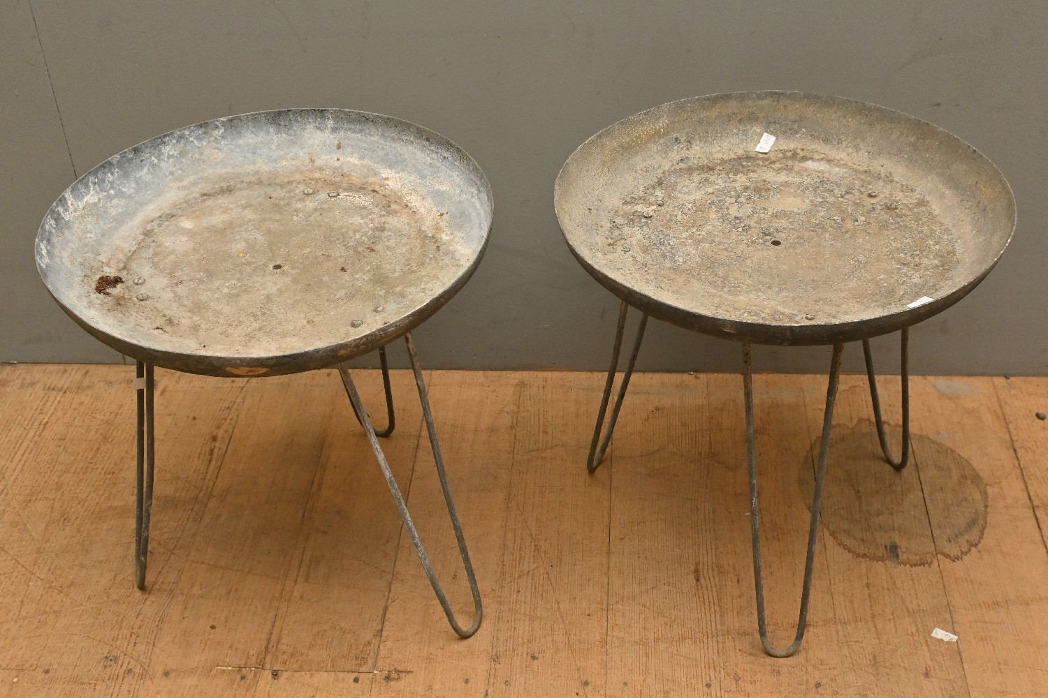 A PAIR OF RETRO GALVANISED PLANTERS ON STANDS (A/F) (40H X 39D CM) (LEONARD JOEL DELIVERY SIZE: LARGE)