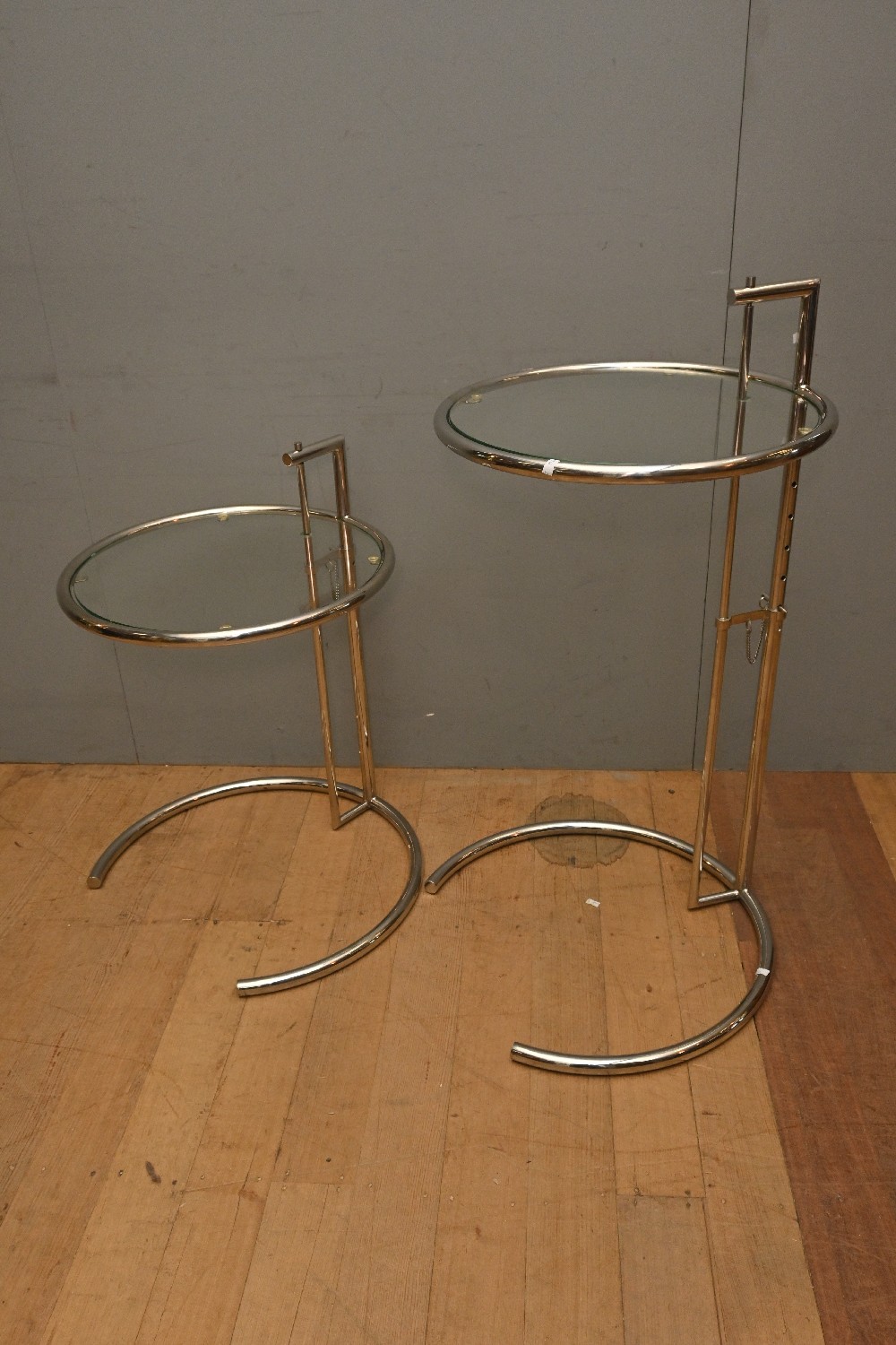 A PAIR OF ADJUSTABLE HEIGHT GLASS AND CHROME SIDE TABLES IN THE STYLE OF EILEEN GRAY (97H X 50D CM) (LEONARD JOEL DELIVERY SIZE: LARGE)