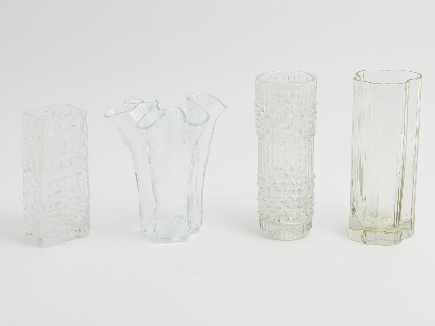 FOUR MODERN GLASS VASES INCLUDING A FINNISH FOLDED VASE, A CZECH VASE BY FRANTISEK PECEMY AND TWO SCANDINAVIAN VASES H.23CM (TALLEST), LEONARD JOEL DELIVERY SIZE: MEDIUM