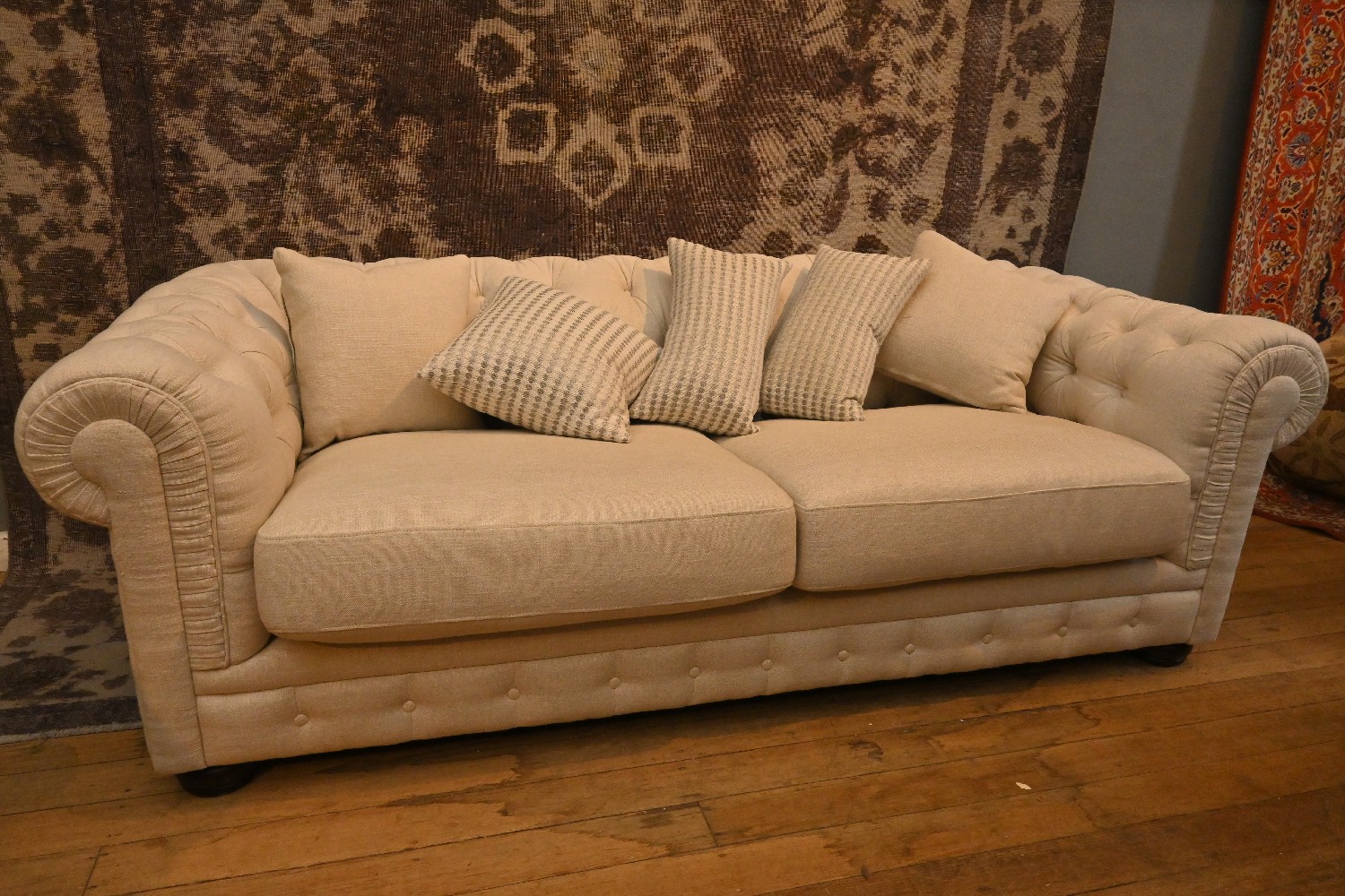 A FRENCH EMPIRE CREAM BELGIAN LINEN SOFA (76H X 228W X 108D CM) (PLEASE NOTE THIS HEAVY ITEM MUST BE REMOVED BY CARRIERS AT THE CUSTOMER'S EXPENSE. LEONARD JOEL STAFF CANNOT ASSIST CARRYING THIS ITEM) (X-LARGE ITEM)
