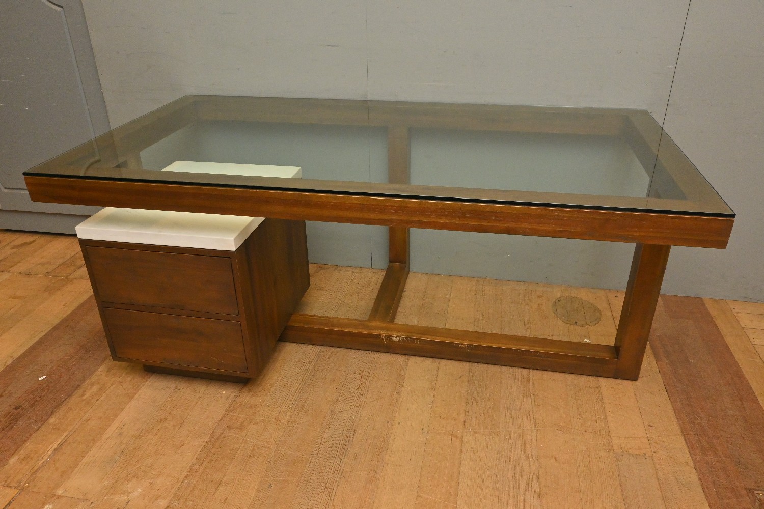 A TOLEO DESK WITH GLASS TOP, TIMBER FRAME & MARBLE TOP DRAW UNIT (A/F) (77H X 181W X 95D CM) (PLEASE NOTE THIS HEAVY ITEM MUST BE REMOVED BY CARRIERS AT THE CUSTOMER'S EXPENSE. LEONARD JOEL STAFF CANNOT ASSIST CARRYING THIS ITEM) (X-LARGE ITEM)