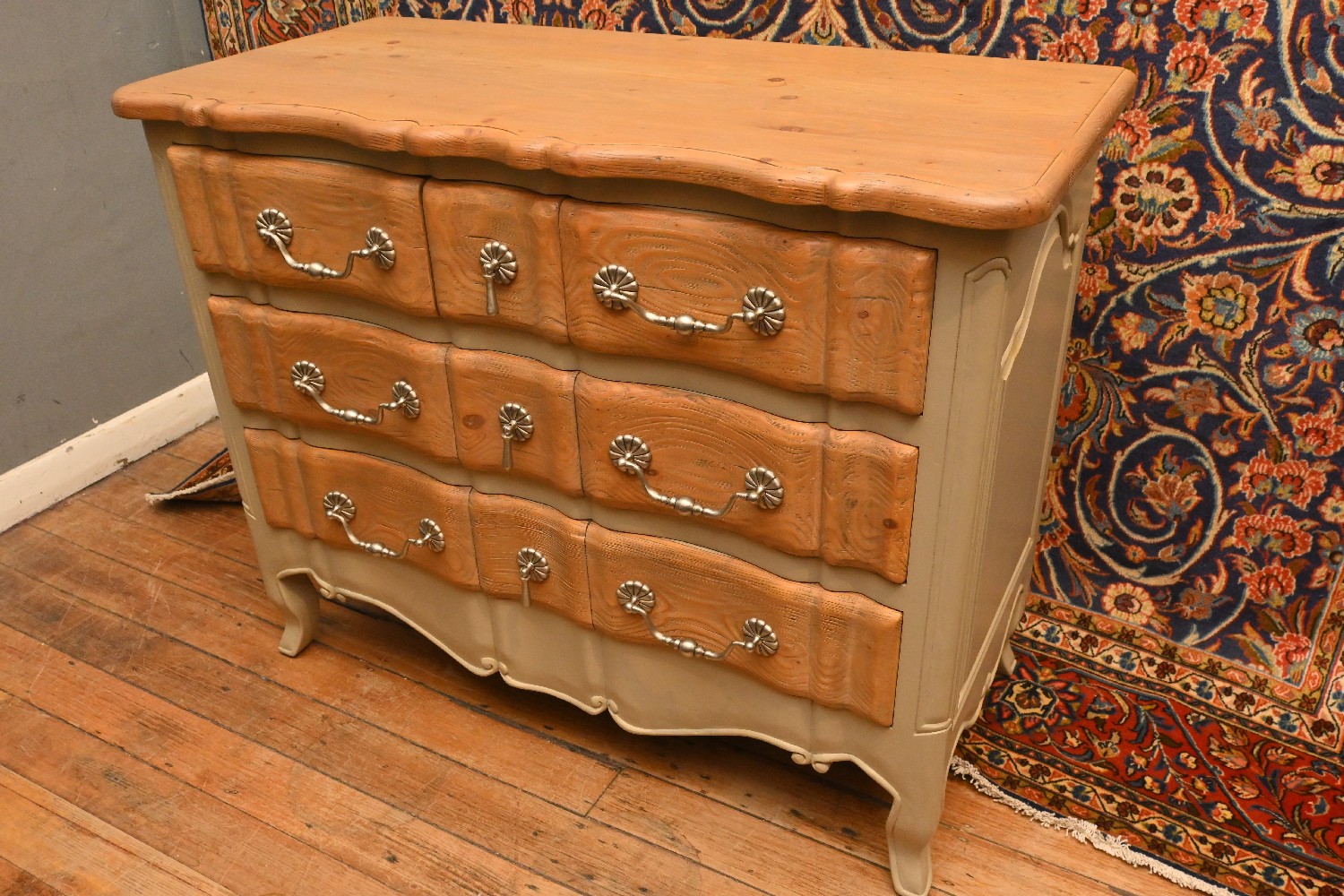 AN AMERICAN OAK CHEST OF DRAWERS WITH SILVERED HANDLES (A/F) (92H X 116W X 54D CM) (PLEASE NOTE THIS HEAVY ITEM MUST BE REMOVED BY CARRIERS AT THE CUSTOMER'S EXPENSE. LEONARD JOEL STAFF CANNOT ASSIST CARRYING THIS ITEM) (X-LARGE ITEM)