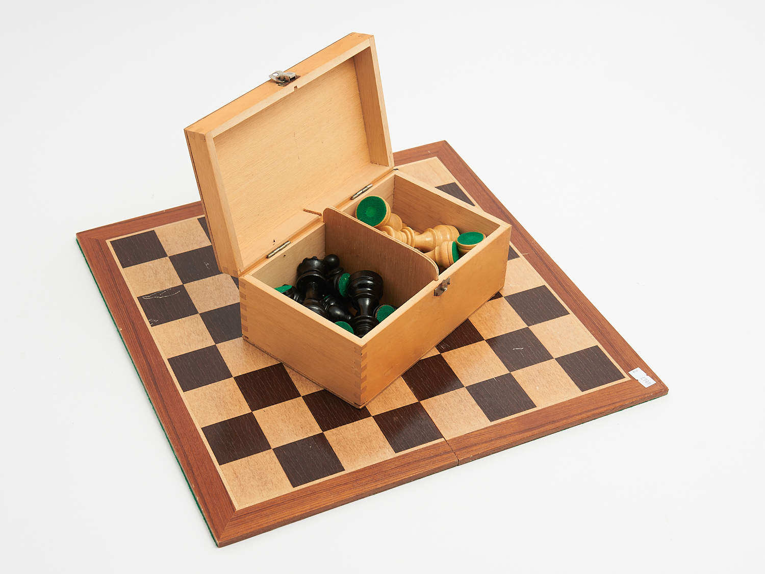 A FOLDING WOODEN CHESSBOARD WITH MATCHED BOXWOOD AND EBONY CHESS PIECES 40.5 X 40.5CM, LEONARD JOEL LOCAL DELIVERY: MEDIUM