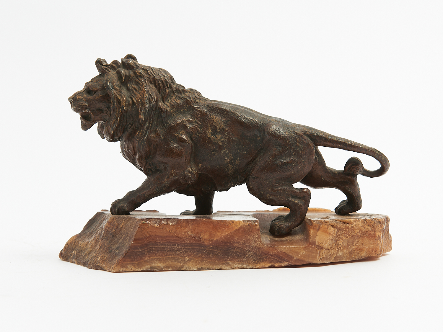 A 19TH-CENTURY BRONZED SMELTER LION FIGURE ATOP MARBLE BASE L.20CM, LEONARD JOEL LOCAL DELIVERY: SMALL