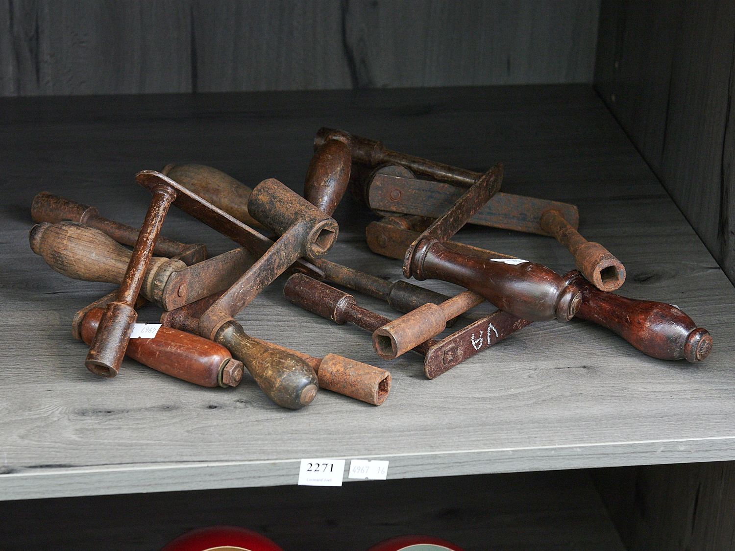 NINE ANTIQUE WOODEN AND IRON TABLE EXTENSION WINDERS L.33CM (LONGEST), LEONARD JOEL LOCAL DELIVERY: MEDIUM