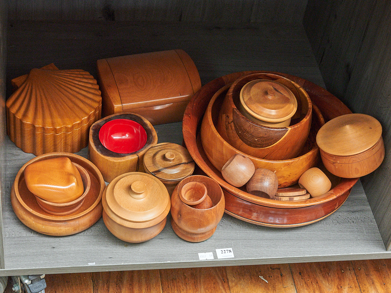 A LARGE COLLECTION OF AUSTRALIAN HUON PINE AND SASSAFRASS BOWLS AND LIDDED CONTAINERS DIA.30CM (LARGEST BOWL), LEONARD JOEL LOCAL DELIVERY: MEDIUM