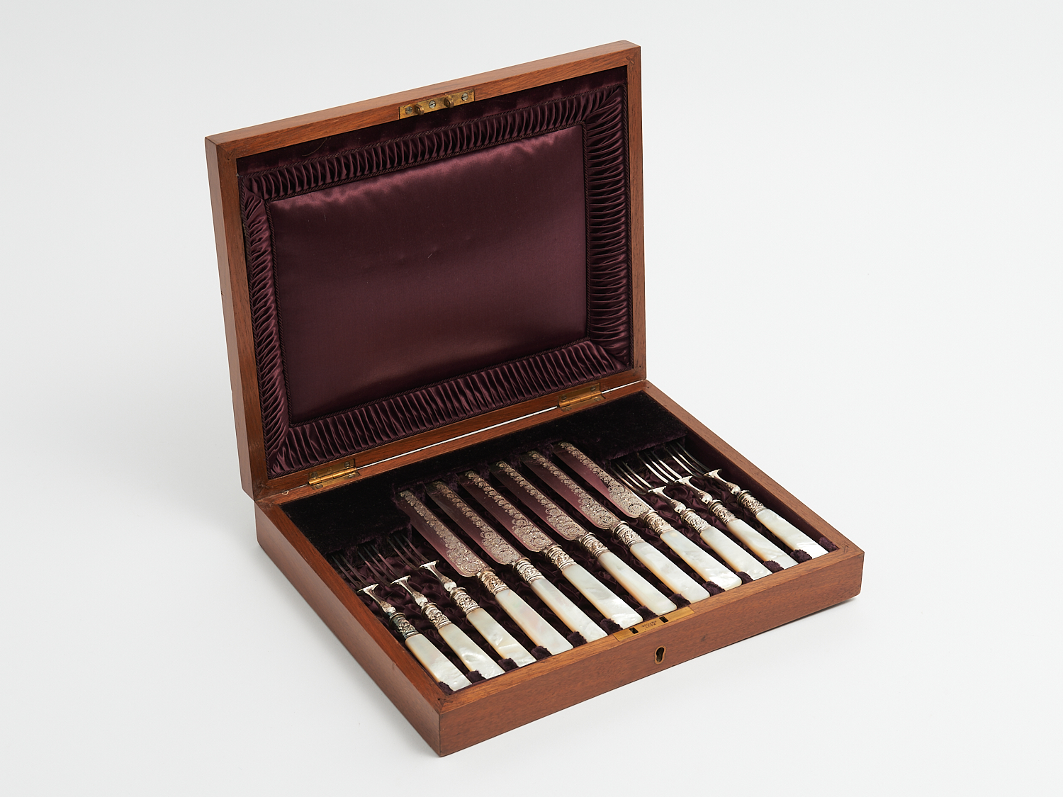 A VICTORIAN MOTHER-OF-PEARL HANDLED SILVER FERRULE FRUIT CUTLERY SET IN ORIGINAL MAHOGANY BOX W.29CM, LEONARD JOEL LOCAL DELIVERY: MEDIUM