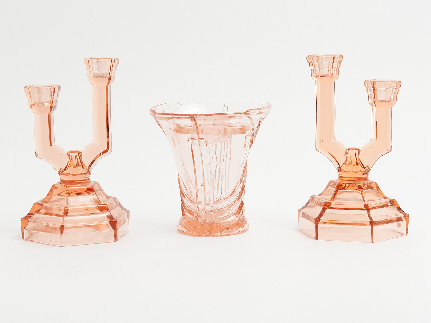 A PAIR OF ART DECO PEACH GLASS CANDLE STICKS AND MATCHED VASE WITH FLOWER ARRANGER H.20CM (CANDLESTICKS), LEONARD JOEL LOCAL DELIVERY: MEDIUM