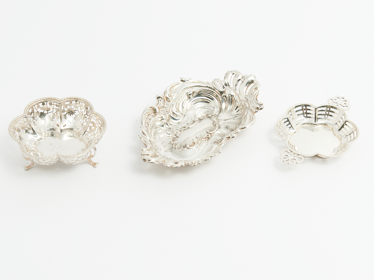 THREE ENGLISH HALLMARKED STERLING SILVER JEWELRY BOWLS, 177G, W.17CM (WIDEST), LEONARD JOEL LOCAL DELIVERY: SMALL