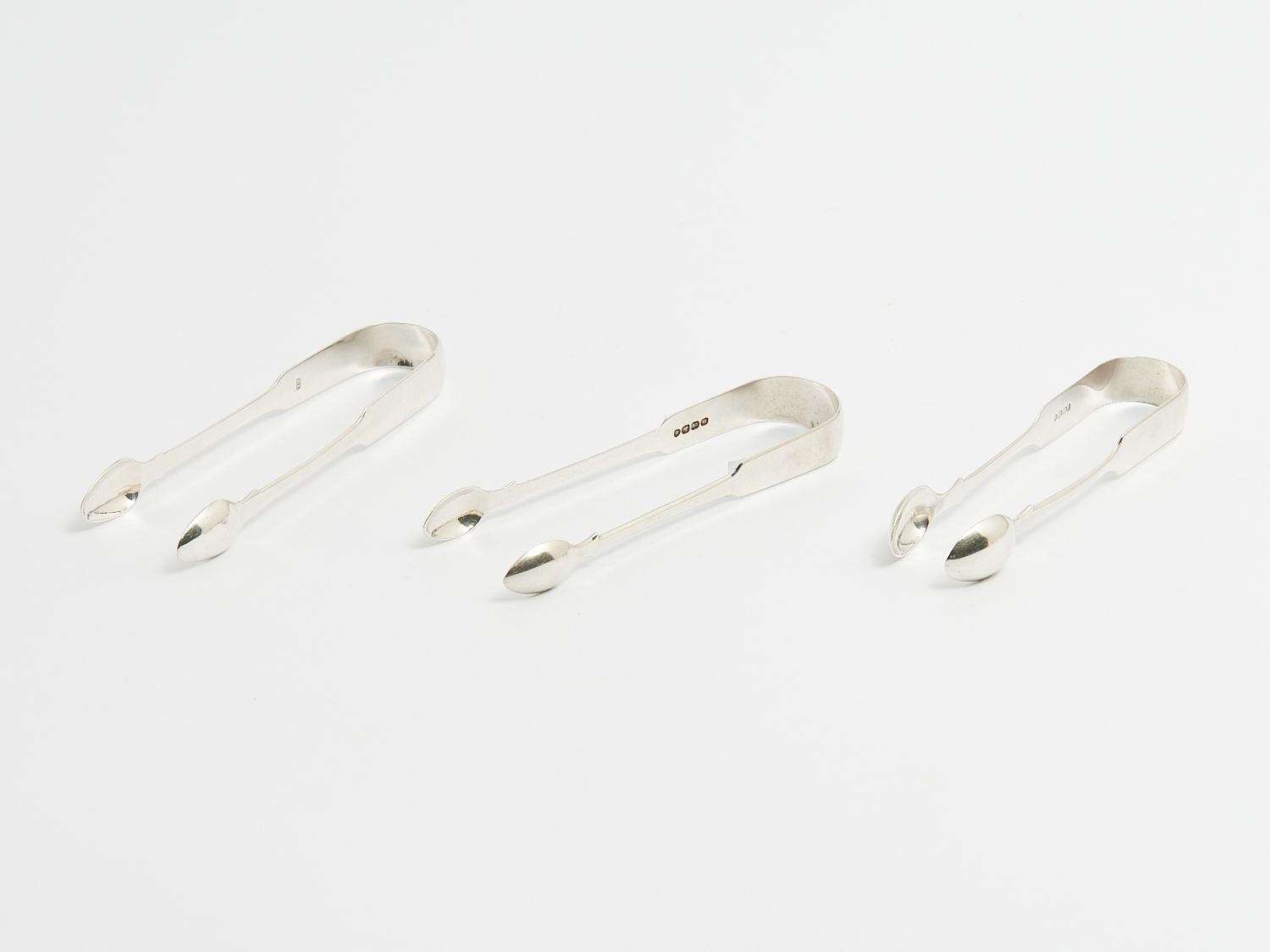 THREE PAIRS OF ENGLISH HALLMARKED STERLING SILVER GEORGIAN SUGAR TONGS 128G, L.14.5CM (LONGEST), LEONARD JOEL LOCAL DELIVERY: SMALL