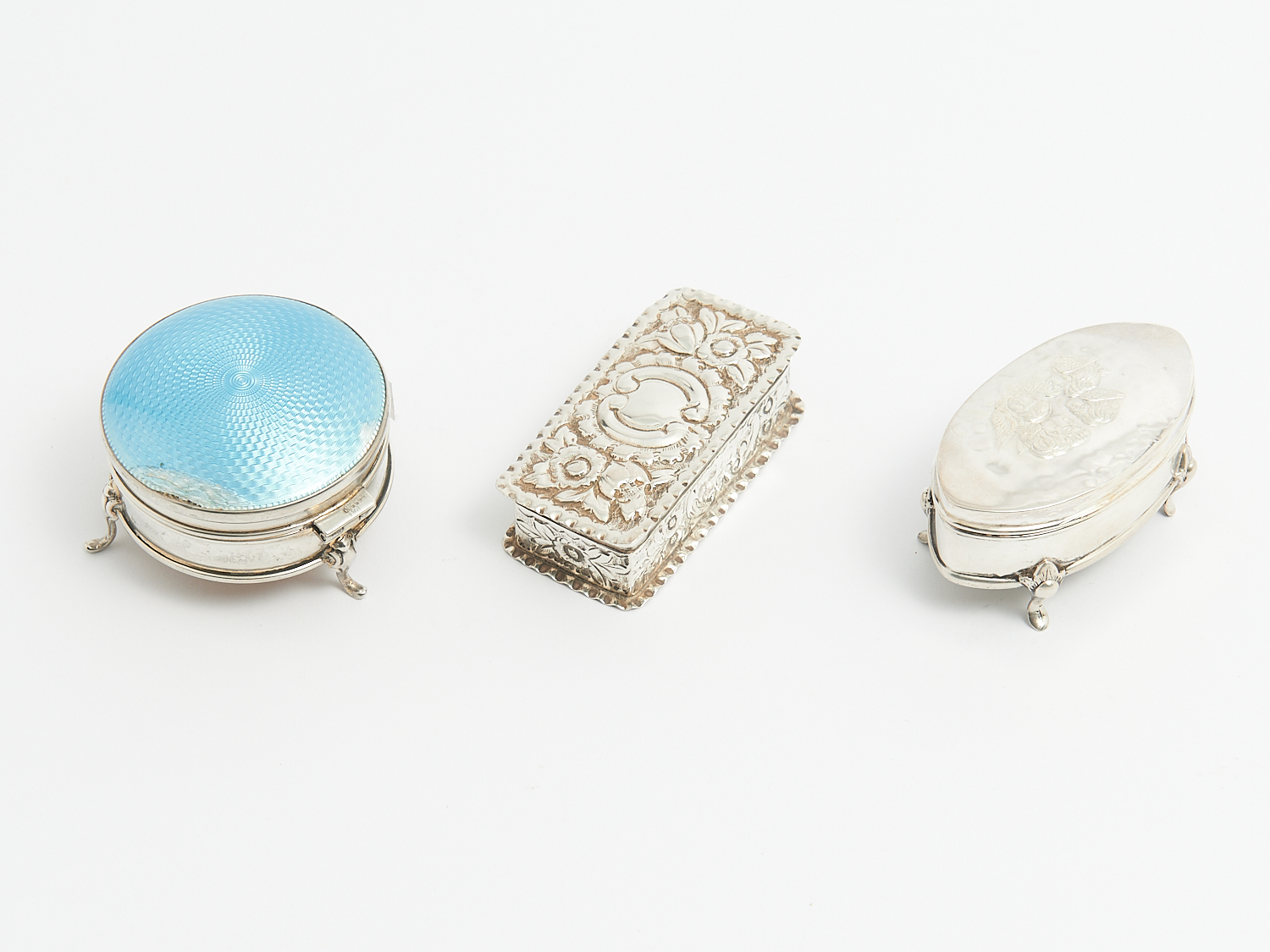 THREE ENGLISH STERLING SILVER CONTAINERS INCLUDING REYNOLDS ANGELS TOPPED AND ENAMEL (A/F), TOTAL WEIGHT 136G, H.4CM, LEONARD JOEL LOCAL DELIVERY: SMALL