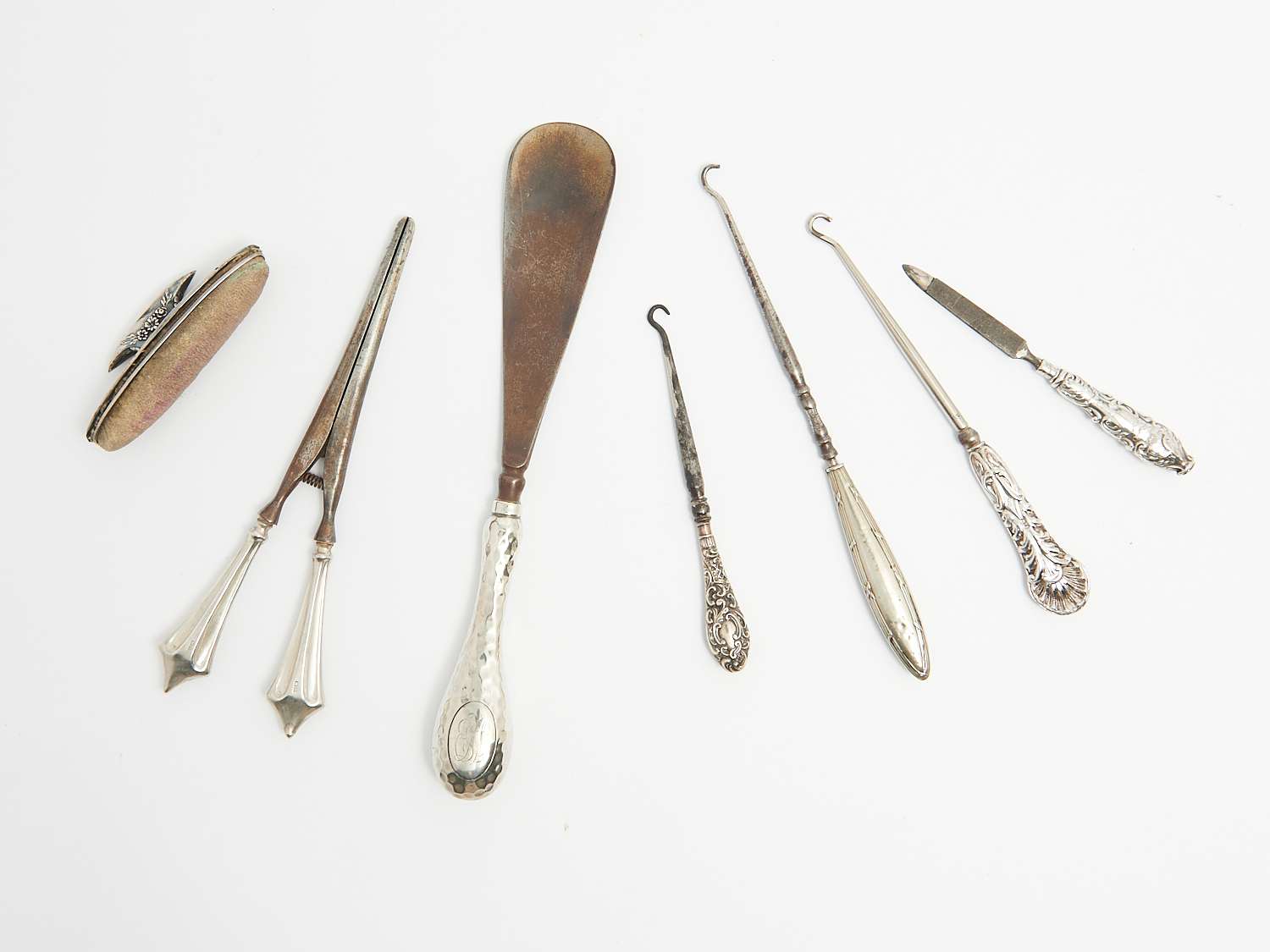 SEVEN STERLING SILVER HANDLES ACCESSORIES INCLUDING GLOVE STRETCHES, BUTTON HOOKS, NAIL BRUSH AND SHOEHORN, TOTAL WEIGHT 278G, L.24.5CM (LONGEST), LEONARD JOEL LOCAL DELIVERY: SMALL
