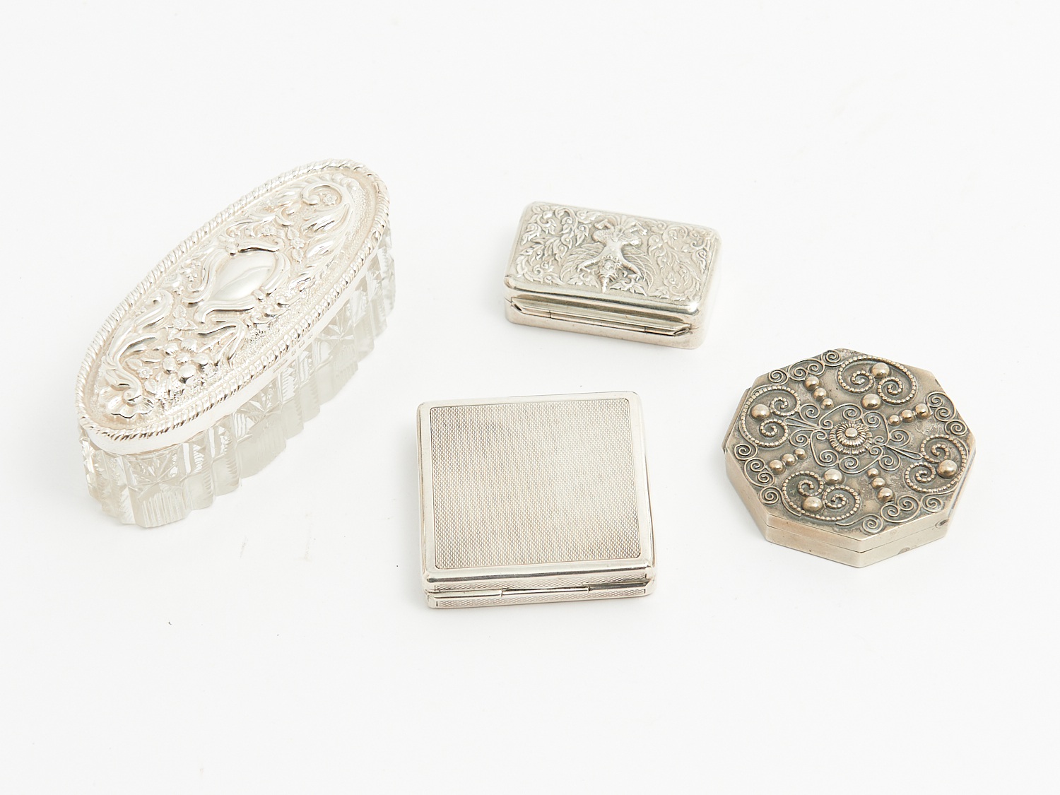 TWO SILVER PILL BOXES, A STERLING SILVER COMPLEX AND A STERLING SILVER LIDDED CUT CRYSTAL JAR, L.9.5CM (LONGEST), LEONARD JOEL LOCAL DELIVERY: SMALL