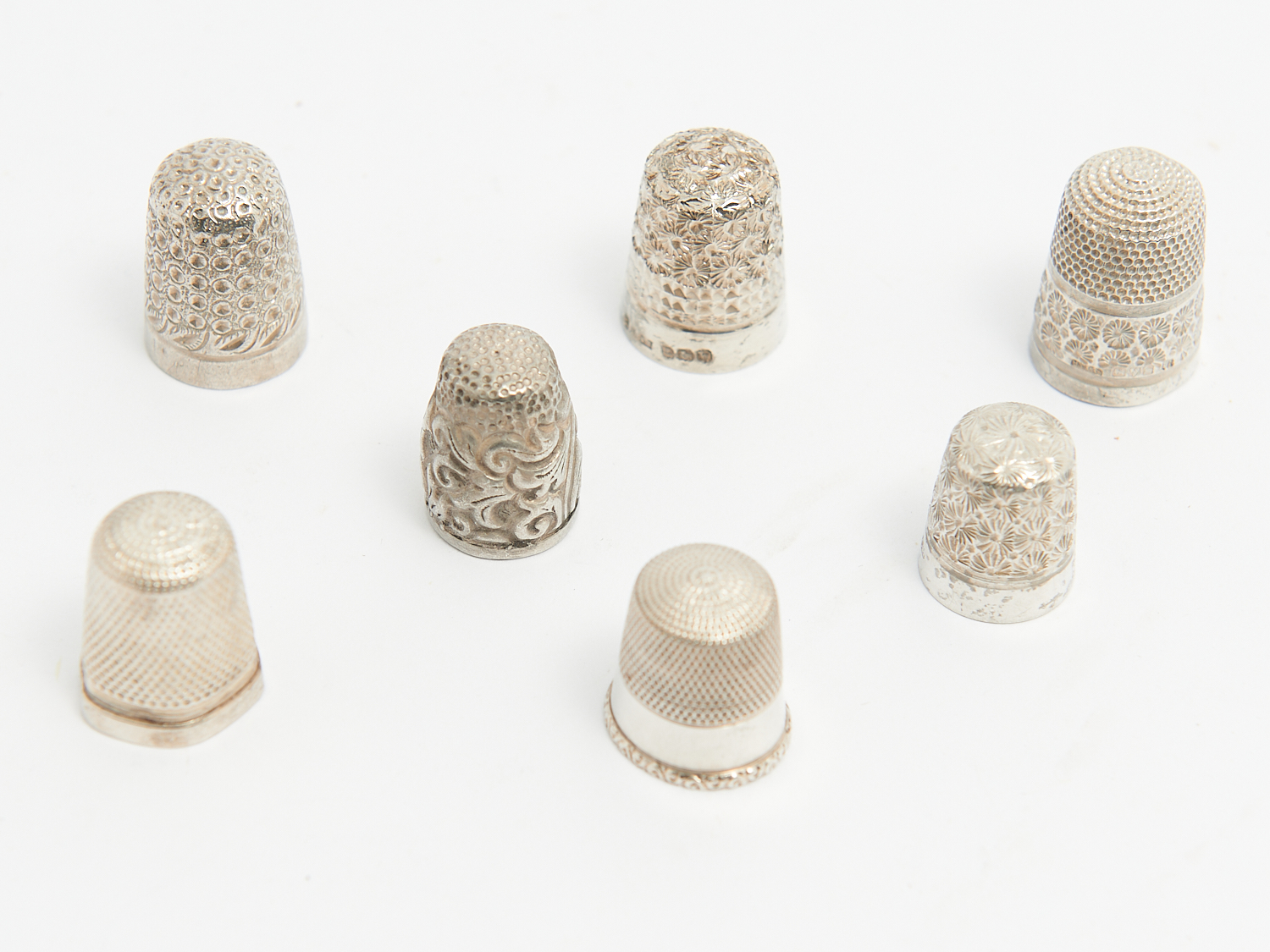 SEVEN ENGLISH THIMBLES INCLUDING FIVE IN STERLING SILVER, 26G, H.2.5CM, LEONARD JOEL LOCAL DELIVERY: SMALL