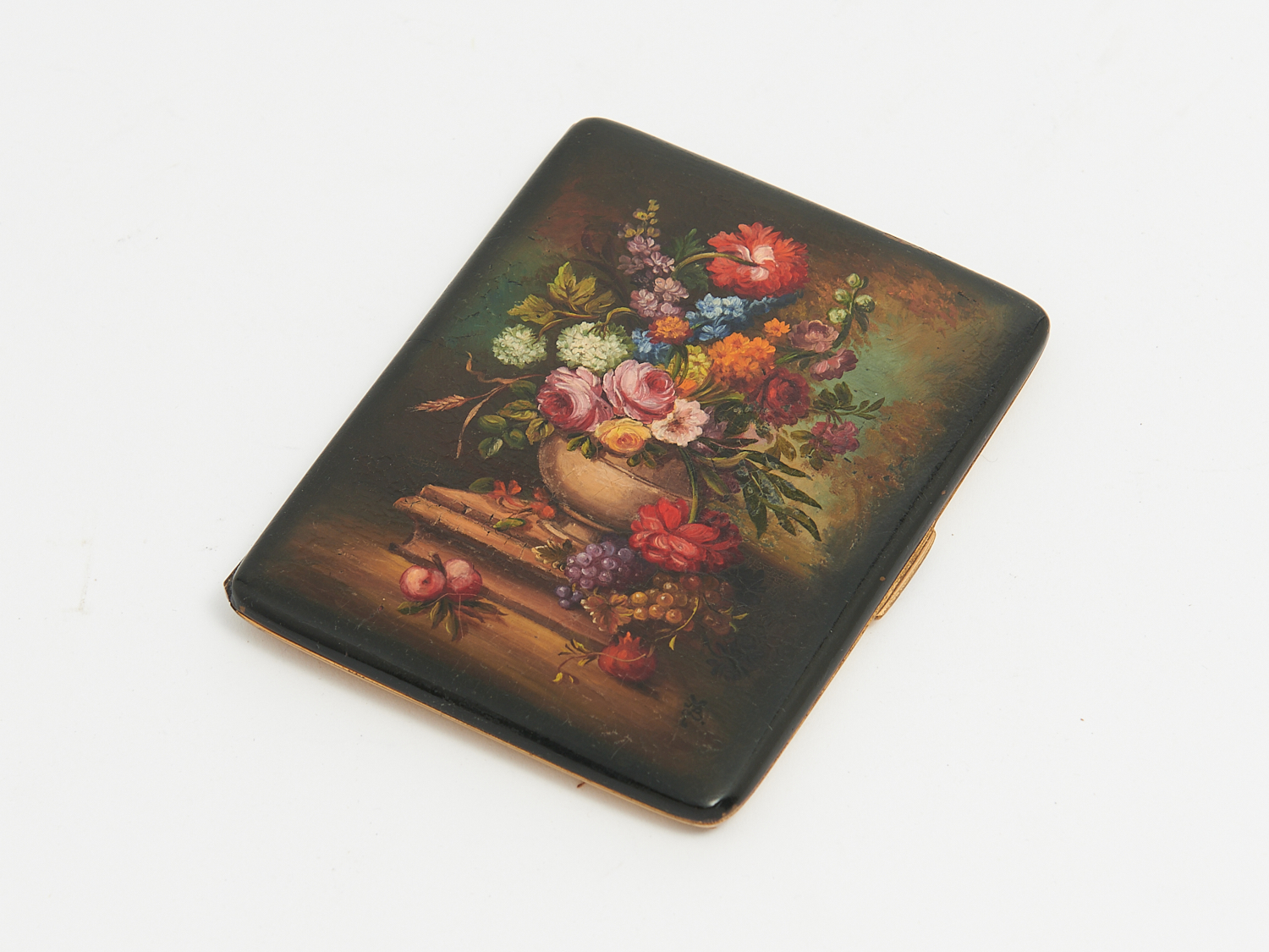 A 19TH CENTURY ENGLISH BRASS CIGARETTE/CARD CASE WITH HAND PAINTED STILL-LIFE TO LID, H.11CM, LEONARD JOEL LOCAL DELIVERY: SMALL