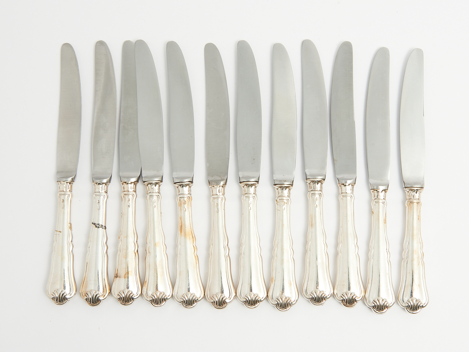 A SET OF TWELVE ART DECO GERMAN HALLMARKED 800 SILVER HANDLED DINNER KNIVES L.20.5CM, LEONARD JOEL LOCAL DELIVERY: SMALL